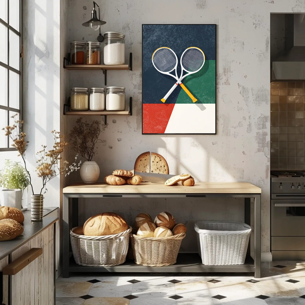 This vibrant poster captures the dynamic essence of tennis by featuring two intersecting rackets poised against a textured background. The color blocks of navy blue, green, red, and white create a modern, minimalist aesthetic that echoes themes of national representation and unity. The rackets, with their white frames and striking yellow and red accents, further emphasize a sporty and energetic mood, making it ideal for spaces dedicated to sports enthusiasts or recreational activities. The elegant design and sharp, clean lines add an artistic flair to any environment, celebrating both the sport and its cultural significance.