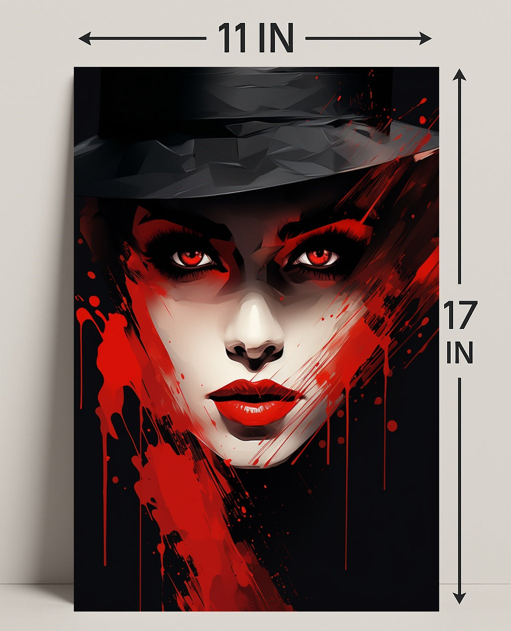 Design: High-impact portrait with red paint splatter accents and dramatic shadow play, ideal for minimalist and contemporary interiors.