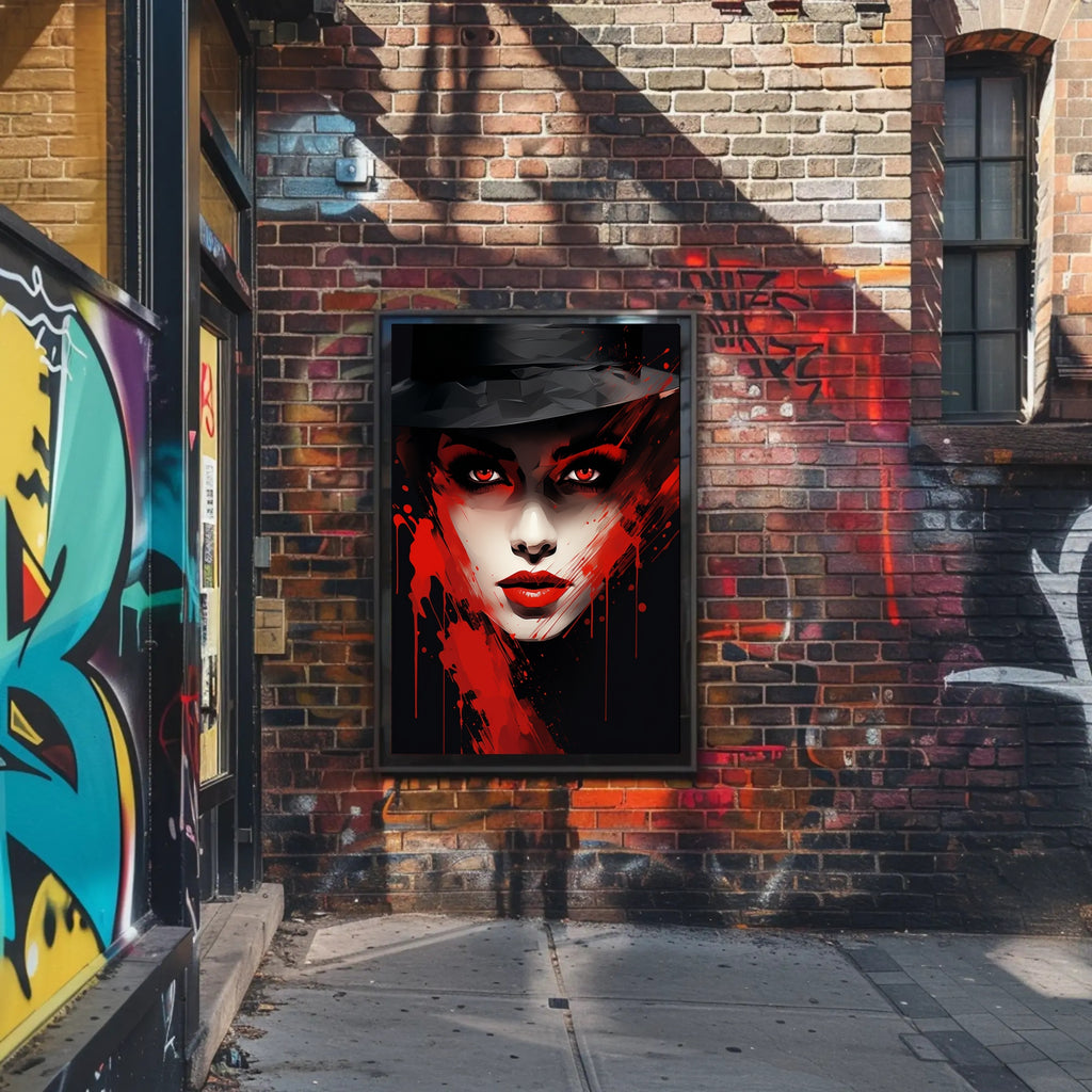 Enigmatic Elegance Poster by PosterGoat transforms any room with a bold, cinematic statement — a minimalist yet dramatic portrait that marries refined beauty with raw, expressive brushstrokes. Striking red splashes cut across a neutral, shadowed face beneath a sculpted hat, creating a mesmerising focal point that draws the eye and sparks conversation.