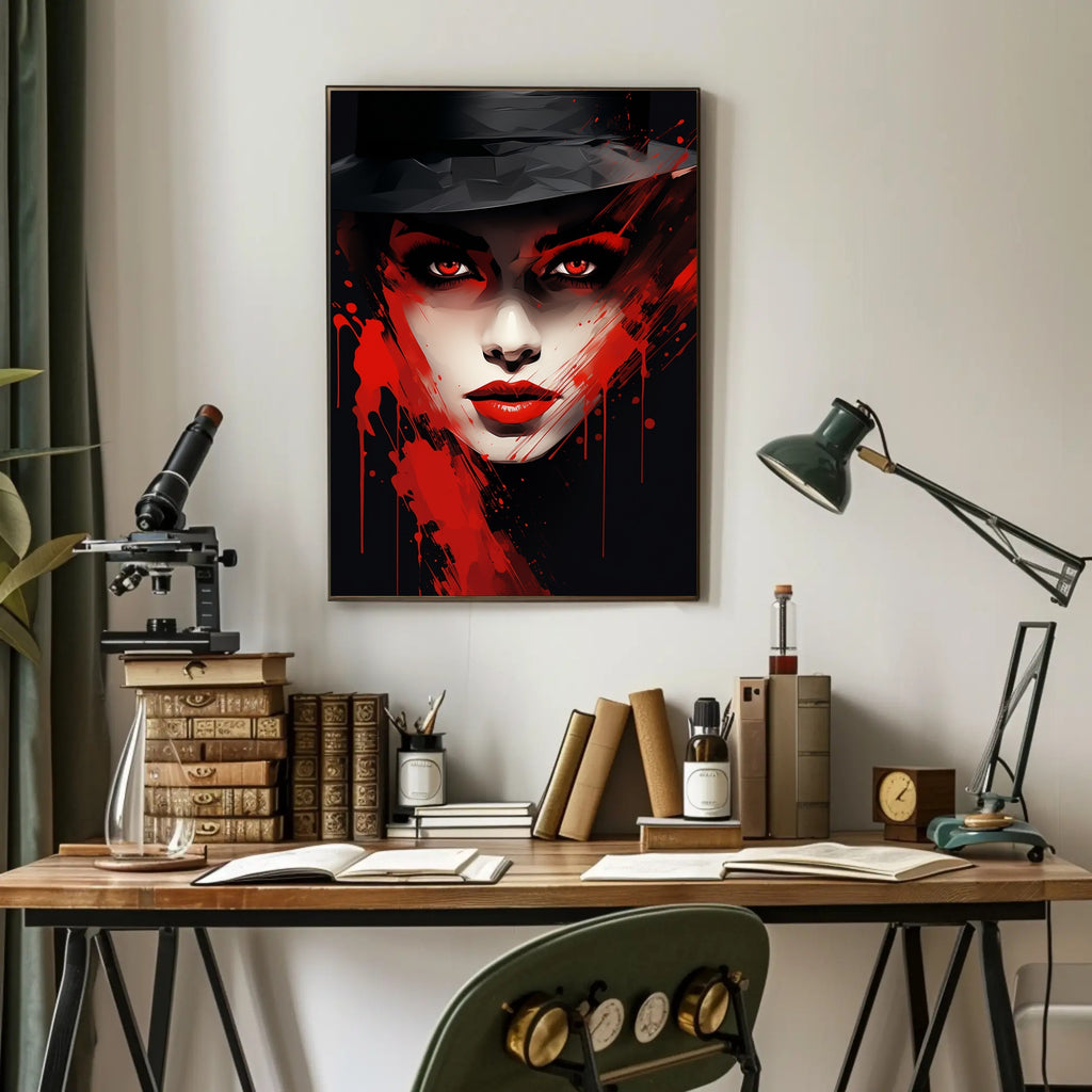 This poster blends contemporary illustration and noir-inspired styling to deliver a piece of wall art that feels both modern and timeless. The close-up composition emphasizes piercing eyes and glossy red lips contrasted against deep blacks and painterly splatters — perfect for galleries, living rooms, offices, or creative spaces.