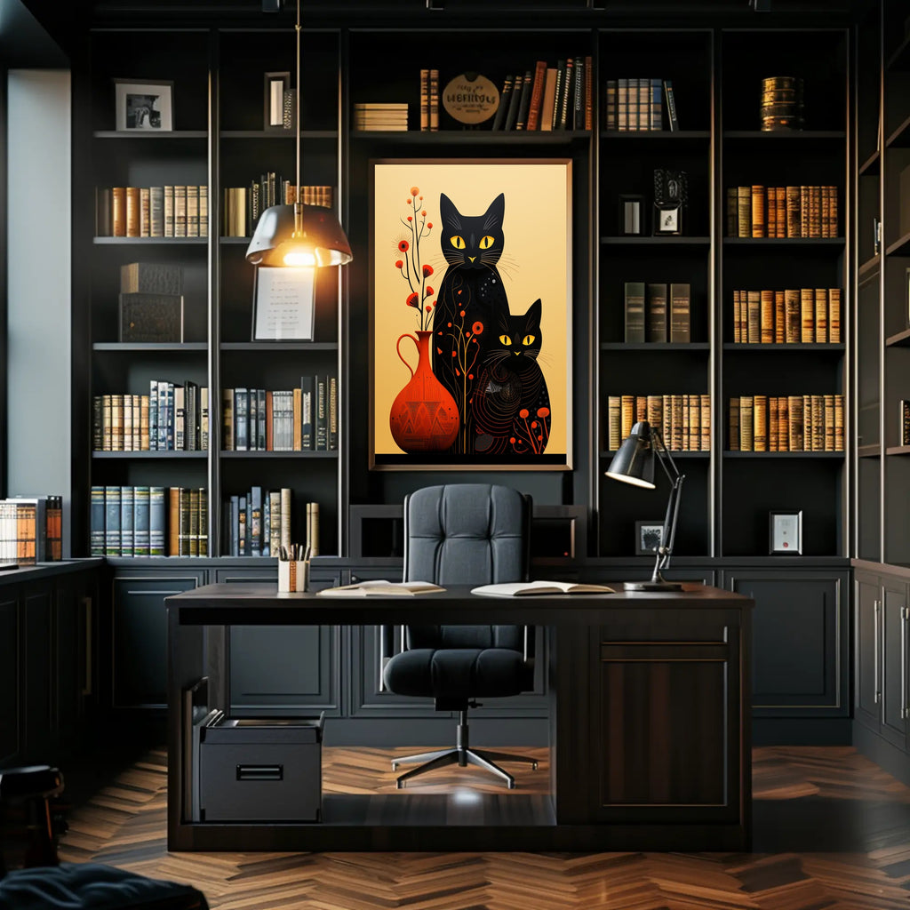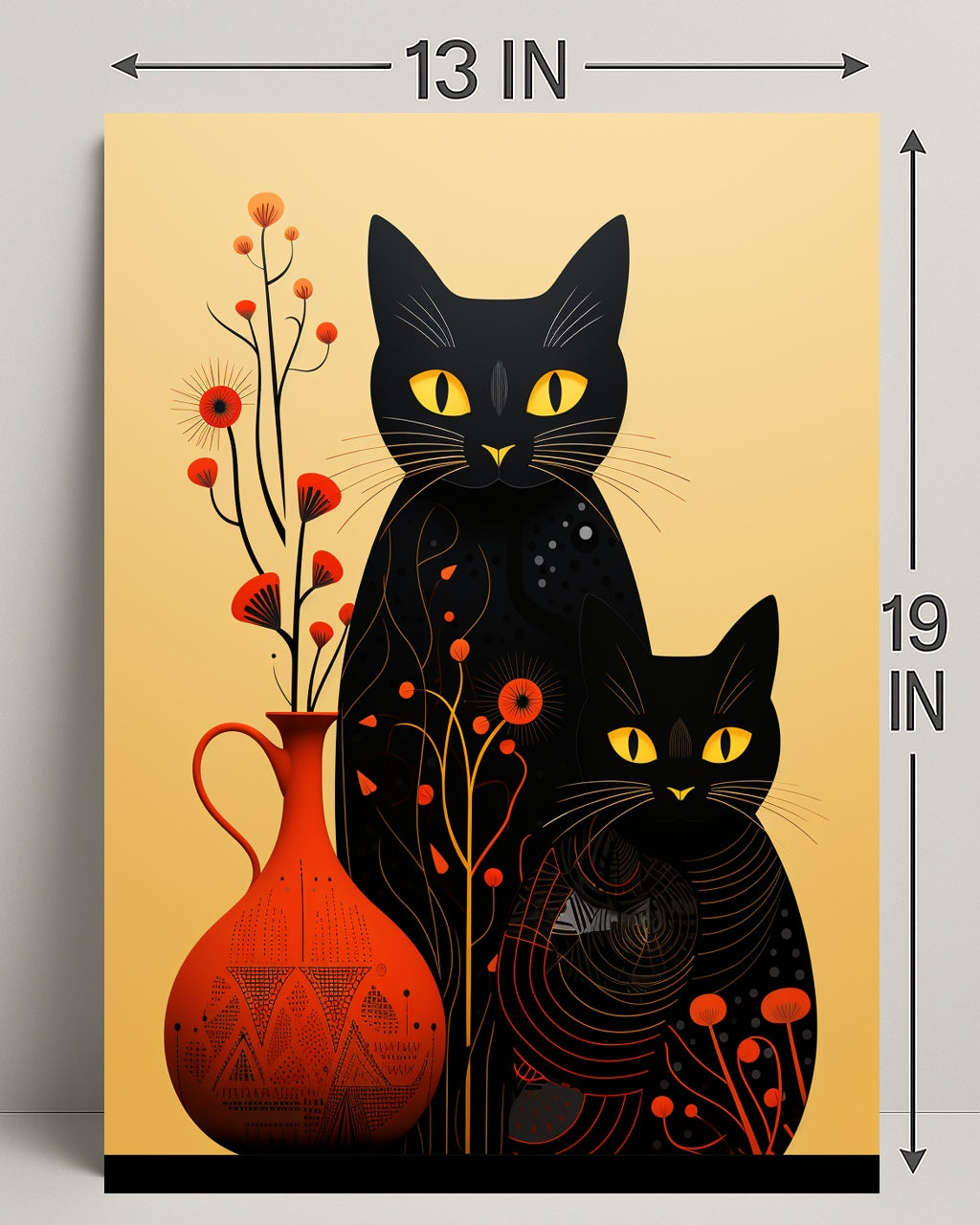 Bring a splash of mystique and botanical elegance to your walls with the Enigmatic Felines And Floral Harmony Poster by PosterGoat. This striking poster pairs two sleek, black felines with luminous yellow eyes and intricate floral motifs—accented by a sculptural red vase—creating a modern, minimalist artwork that commands attention in any room.