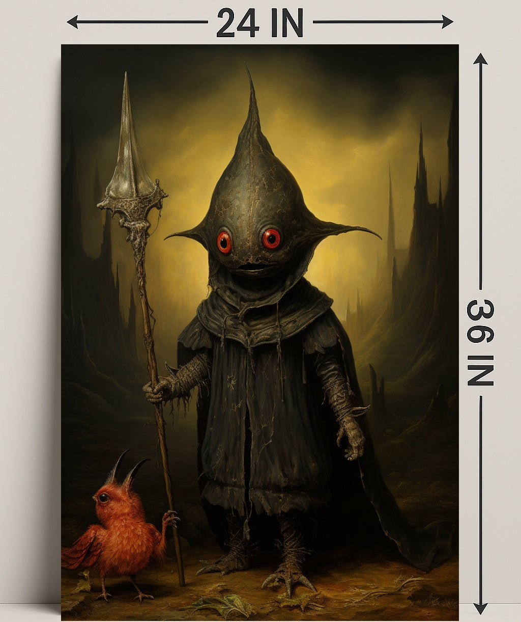 Bring otherworldly charm to your walls with the Enigmatic Guardian Of The Mystical Realm Poster — a striking art print from PosterGoat that blends dark fantasy and minimalist composition to create a powerful focal point for any room. This poster captures a mysterious cloaked guardian with wide red eyes, a worn spear, and a tiny crimson companion against a brooding, golden-hued landscape of jagged spires.