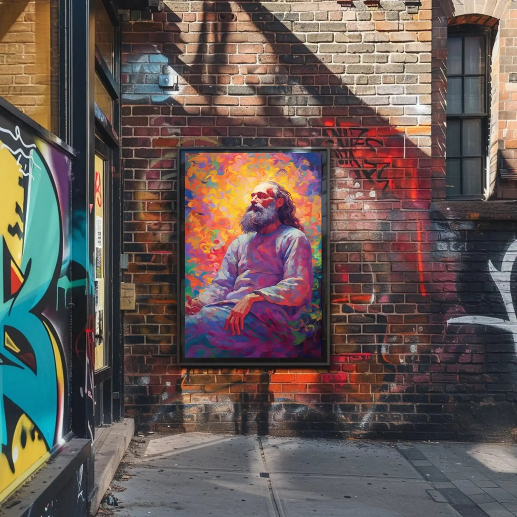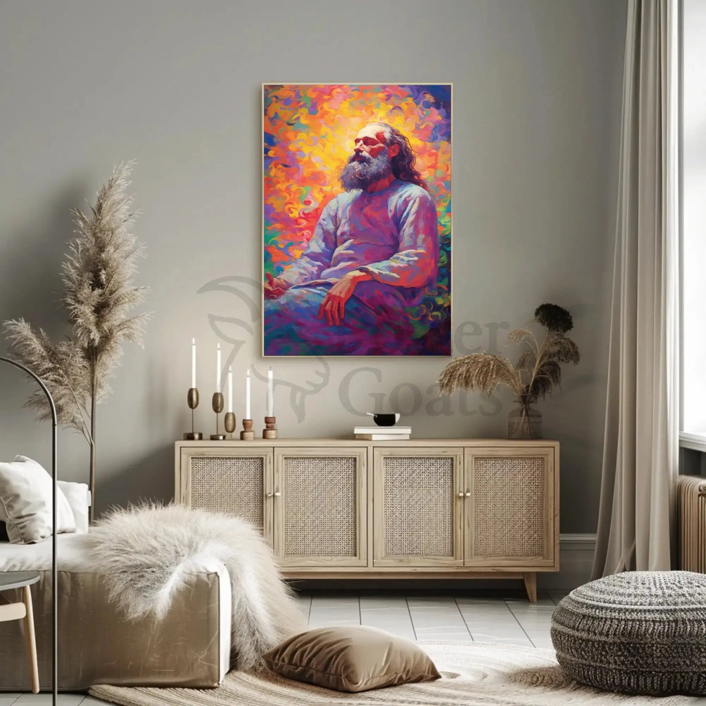 Bring a luminous moment of calm and creativity to your walls with the Enlightened Sage Meditative Spirit Artistic Expression Poster by PosterGoat. This striking poster blends a contemplative portrait with swirling, colorful brushwork—an ideal centerpiece for meditation spaces, creative studios, or any room that benefits from mindful inspiration.