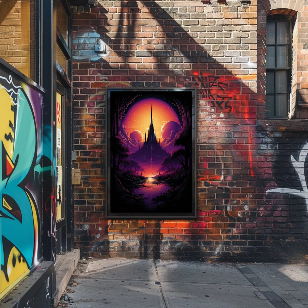 Epic Fantasy Castle in Surreal Cosmic Landscape invites you to immerse yourself in a fantastical realm. This bold poster captures the unique appeal of a towering dark castle silhouetted against a glowing orange-red sun, inviting viewers into an otherworldly adventure.