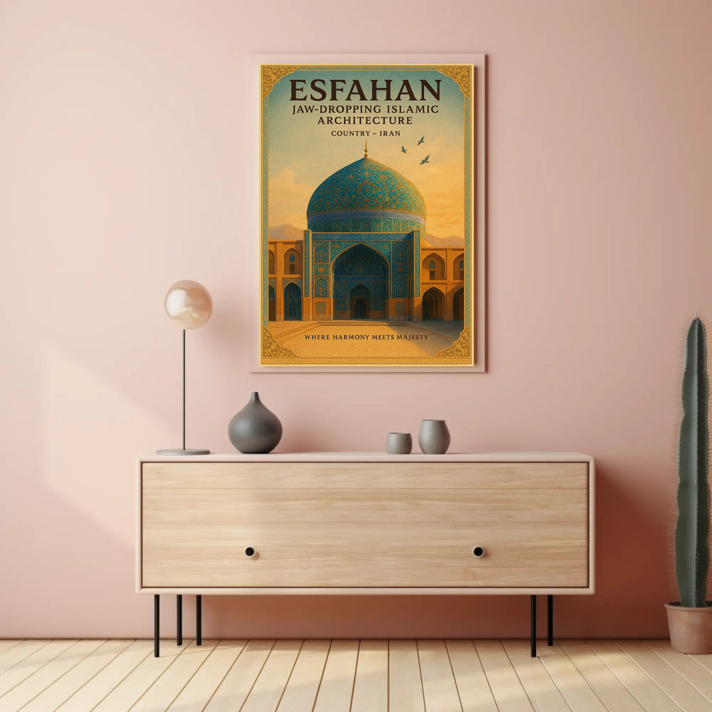 Bring the sublime beauty of Esfahan's historic skyline into your home with the Esfahan Jaw-Dropping Islamic Poster by PosterGoat. This striking artwork captures the mosque's turquoise-tiled dome, intricate geometric patterns and filigree, and the warm golden light of sunset — rendered in a vintage travel-poster style that feels both timeless and modern. The ornate corner borders and soft, sunlit courtyard visible in the image make this piece an elegant focal point for living rooms, offices, or galleries.
