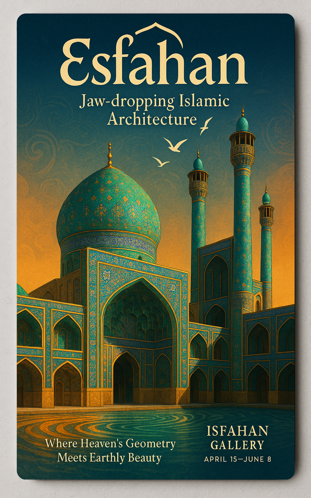Esfahan — Where Heaven's Geometry Meets Earthly Beauty is a striking collectible trading card from PosterGoats that distills the majesty of Islamic architecture into one compact, museum-quality artwork. Rich teal domes and slender minarets rise against a warm sunset sky, while intricate tile geometry and ornamental arches draw the eye into layers of pattern and perspective.