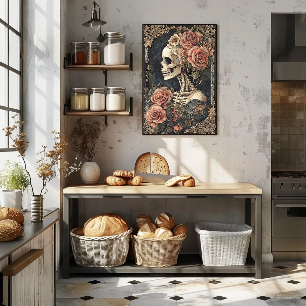 Why collectors choose Eternal Bloom: This print balances delicate floral motifs with gothic symbolism to create an emotional contrast that elevates both contemporary and vintage interiors. The ornate border and lace-like details add a handcrafted feel, while the muted palette ensures easy coordination with existing decor.