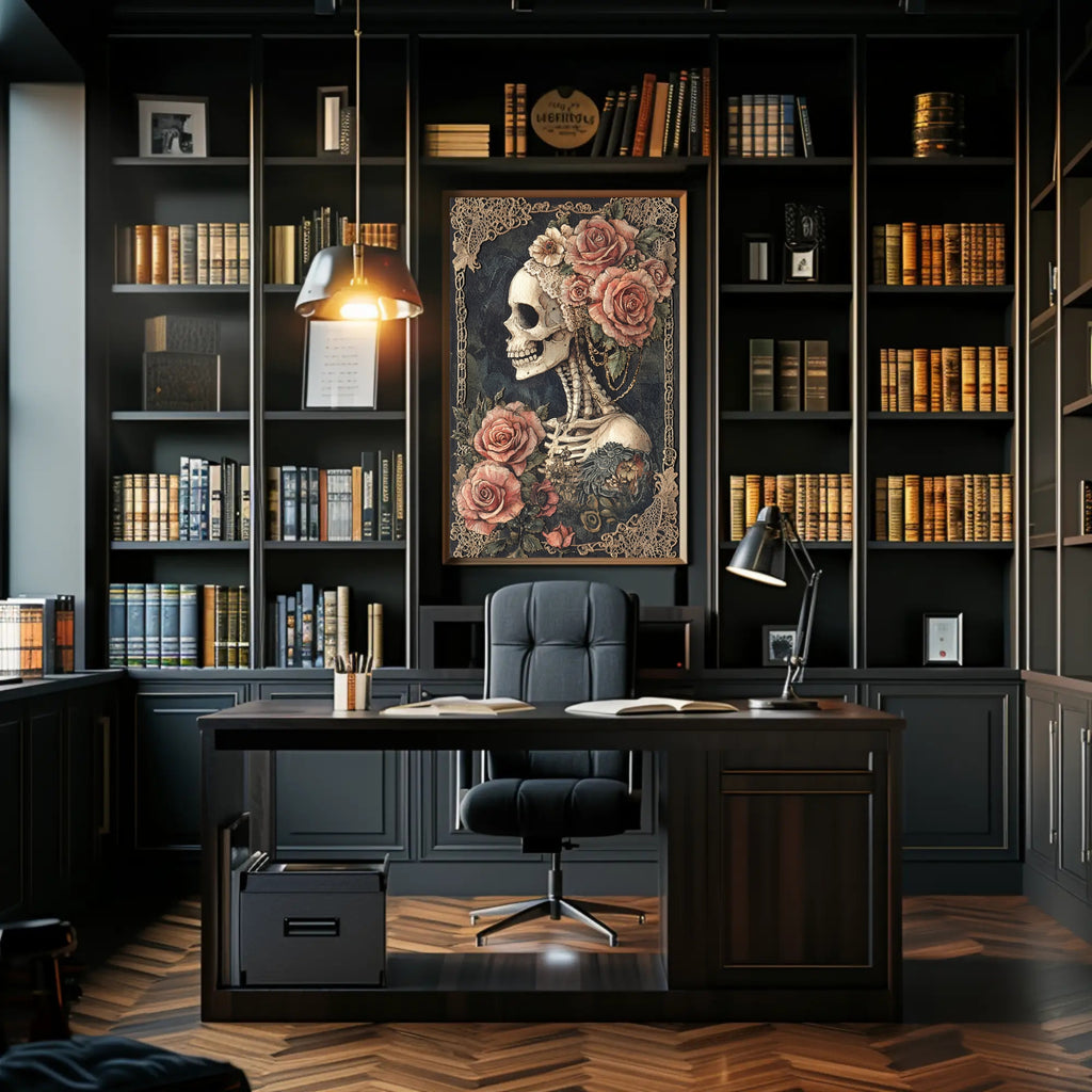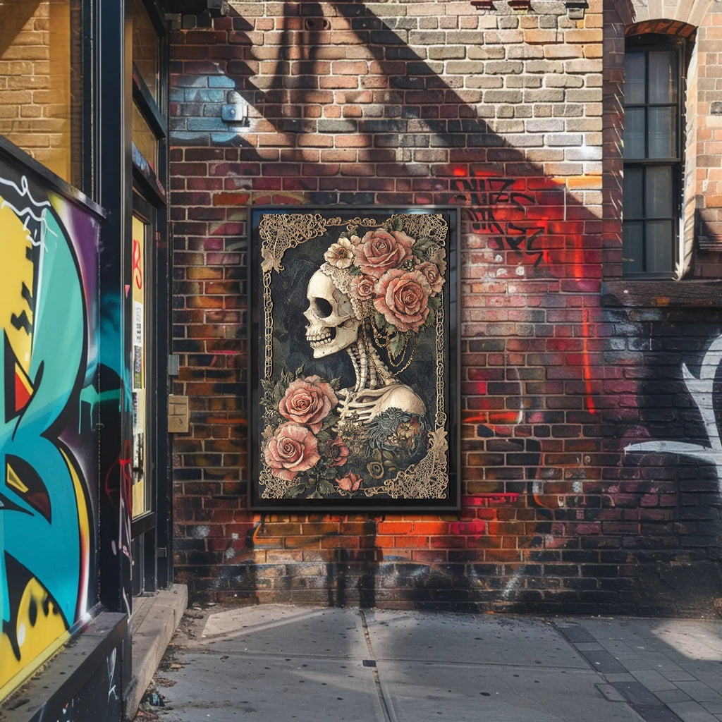 Evocative and elegantly macabre, the Eternal Bloom Poster from PosterGoat blends Victorian romance with gothic charm to create a striking focal point for any room. A graceful skeletal profile is crowned with lush roses, delicate lace, and draped gold chains—rendered in muted vintage tones and framed by ornate filigree—to deliver a hauntingly beautiful piece of wall art designed for decor lovers and wanderlust spirits.