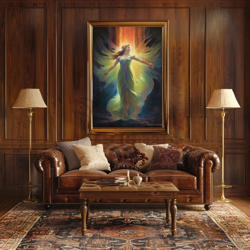 Why you'll love it: The artwork's intricate, dreamlike brushwork and soft, glowing highlights create depth and motion, making it perfect for living rooms, bedrooms, studios, or meditation spaces. Its ethereal composition and mystical illustration style complement modern and eclectic decor while adding a touch of enchantment to your walls.
