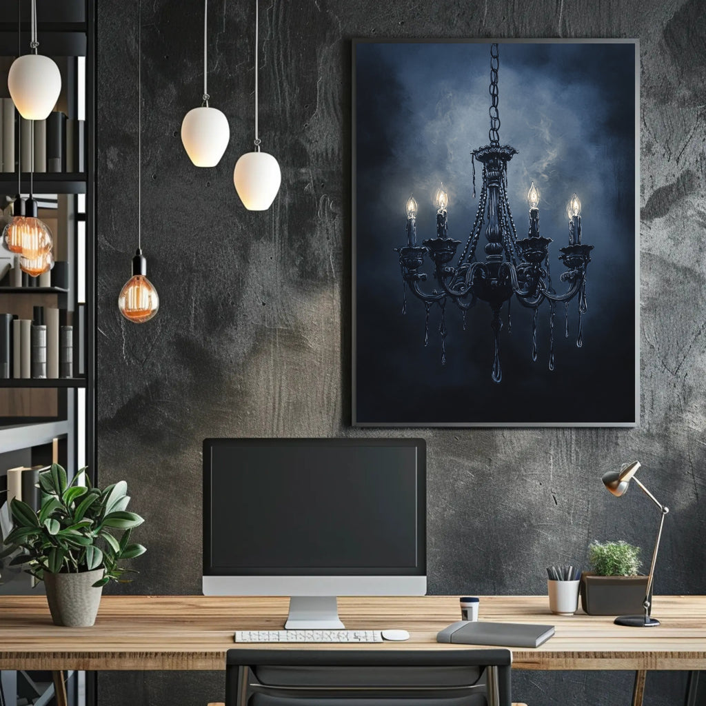 Elevate your walls with the Ethereal Chandelier Poster from PosterGoat — a hauntingly beautiful piece of wall art that blends minimalist elegance with dark, cinematic atmosphere. Rendered in deep indigo tones and soft, smoky textures, this poster features a classic chandelier dripping like liquid glass and crowned with candle-like bulbs that glow through the mist, creating a mysterious focal point for any room.