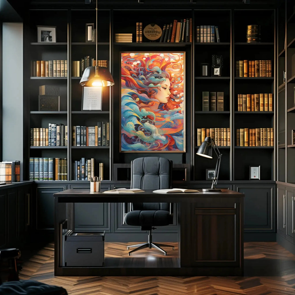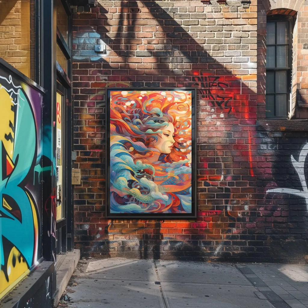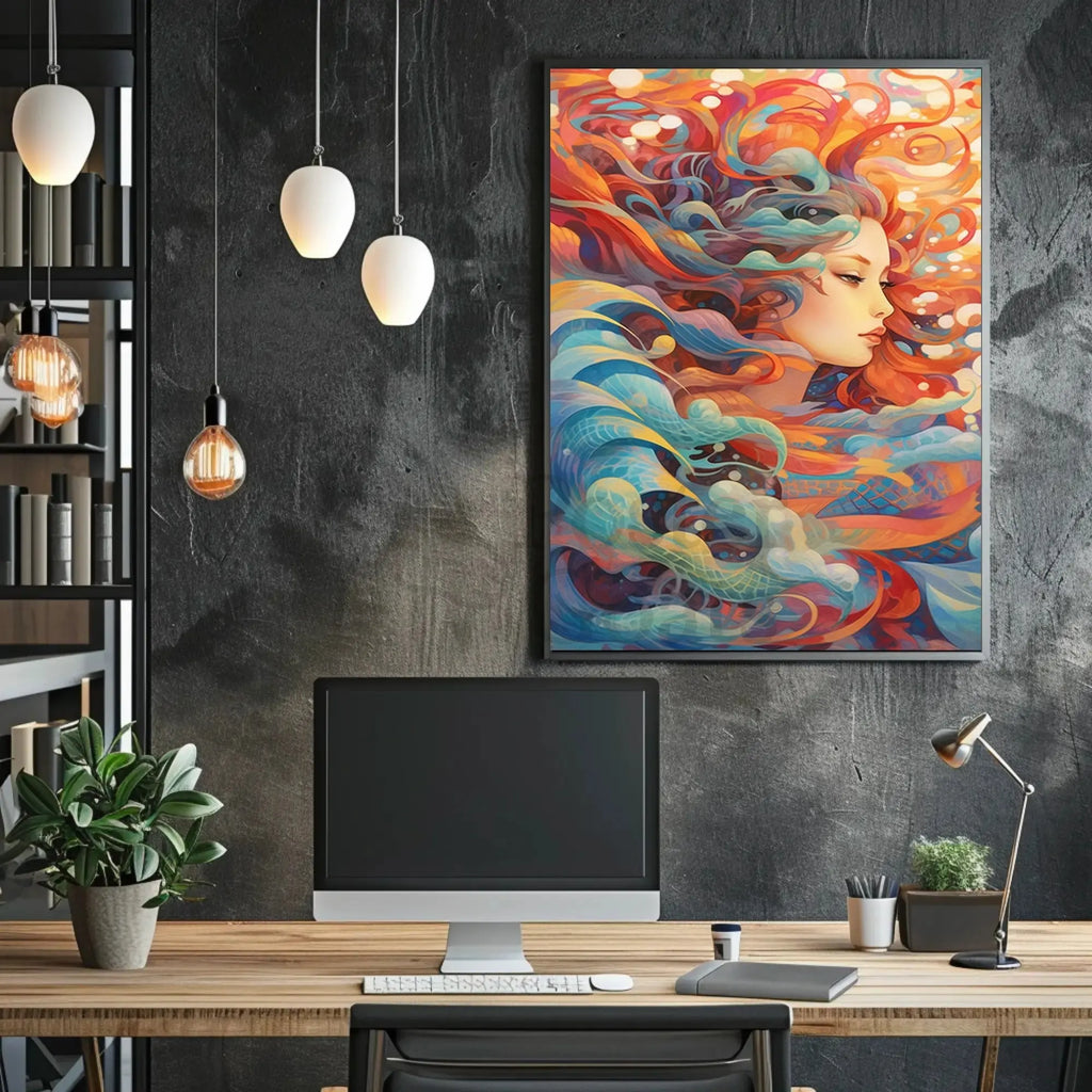 This poster captures a serene mermaid profile surrounded by swirling, painterly waves in a kaleidoscope of orange, turquoise, and coral hues. Intricate linework and flowing textures create motion and depth, making it an ideal colorful poster for living rooms, bedrooms, studios, or any space seeking a splash of Fantasy Decor and ocean-inspired charm.