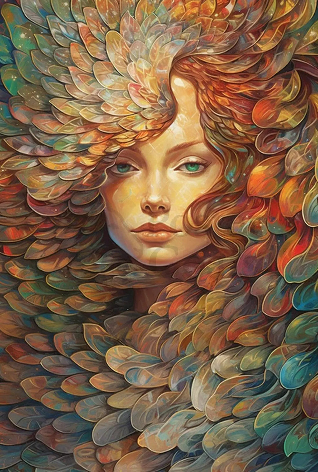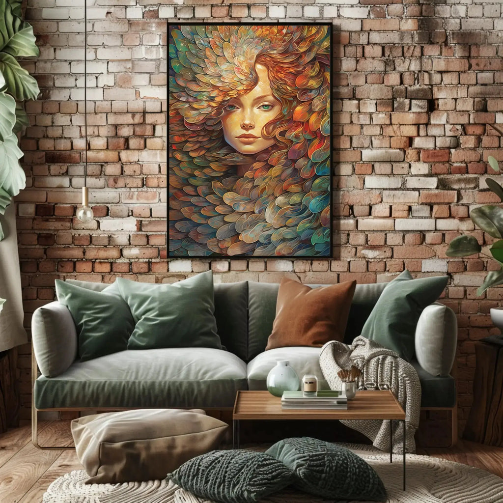 Ethereal Nature Woman with Leaves Artistic Poster — a mesmerizing PosterGoat original that blends surreal femininity and botanical imagination into a vibrant focal piece for your home. Rich, layered leaf motifs swirl into the calm, expressive face of a woman, creating a dreamlike composition that draws the eye and stirs the senses.