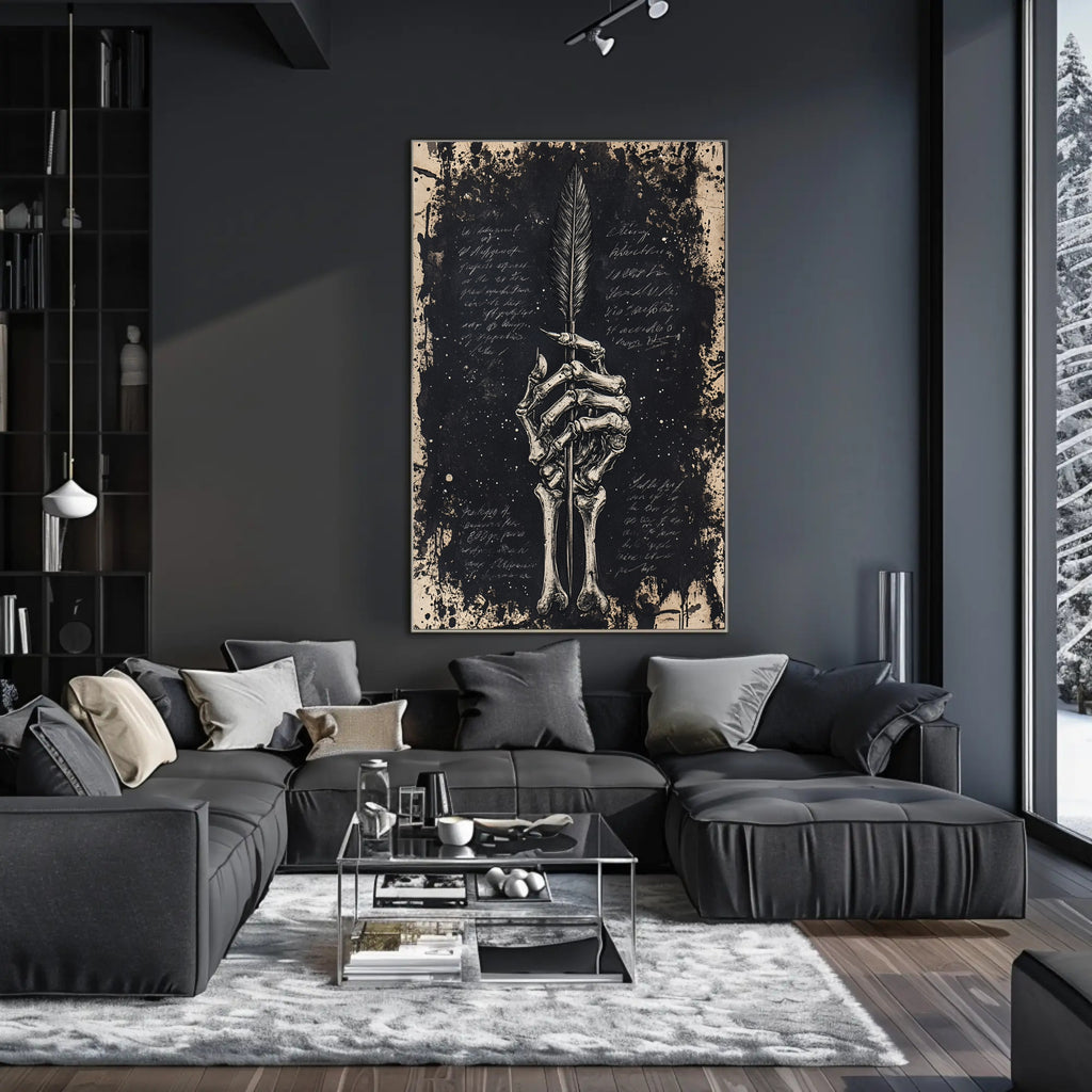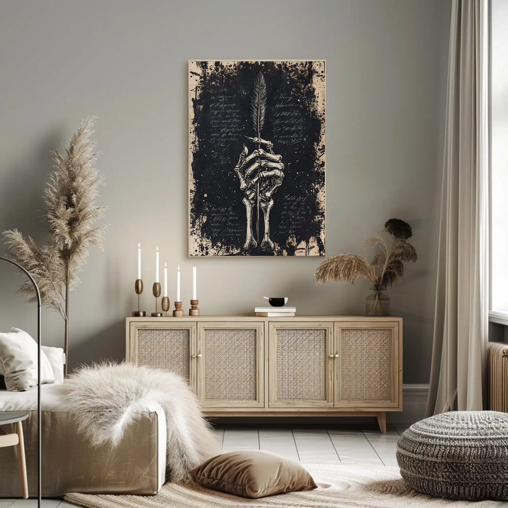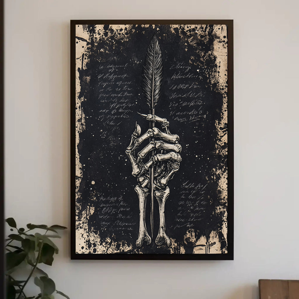 Ethereal Quill Poster from PosterGoat transforms any wall into a striking focal point — a hauntingly beautiful print that blends minimalist composition with vintage macabre charm. Featuring a detailed skeletal hand clasping a fine quill against a distressed, ink-splattered background, this poster evokes wanderlust, mystery, and the poetry of the past.