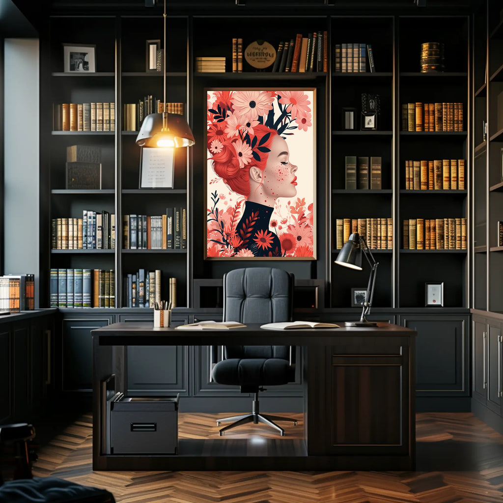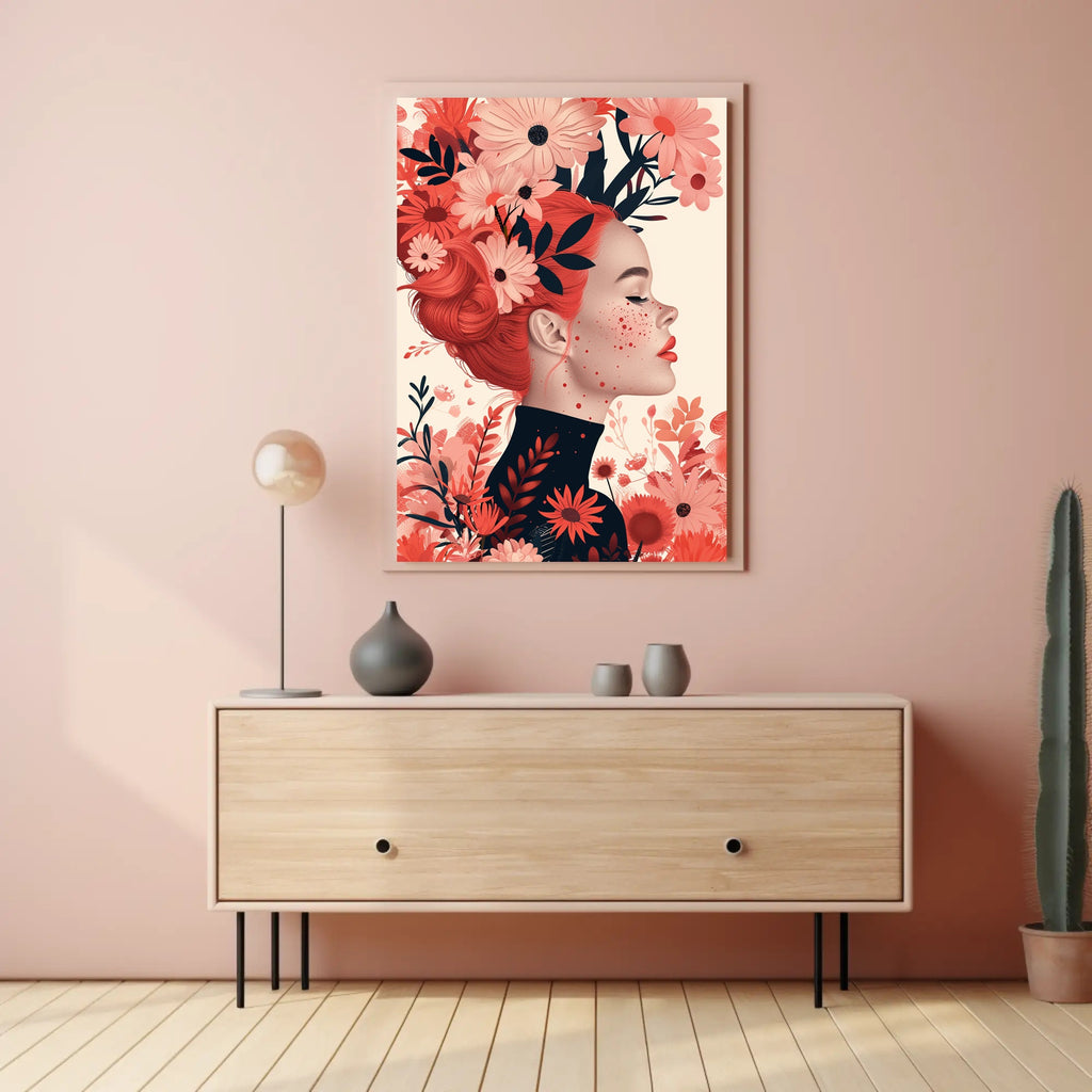 Bring a sophisticated pop of color and poetic charm into your home with the Ethereal Redhead Floral Fusion Art Poster by PosterGoat. Add it to your collection today and transform any wall into an elegant statement of modern floral beauty.
