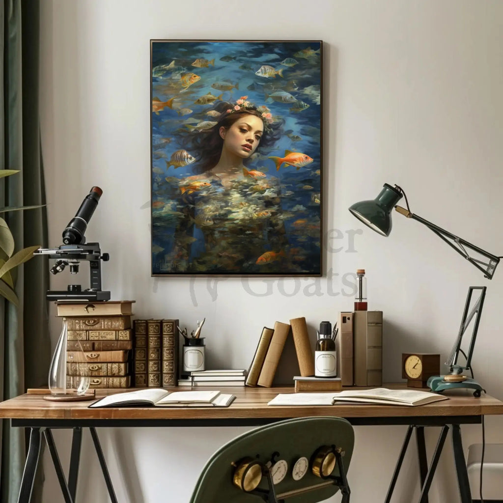 This artistic poster depicts a serene young woman submerged among swirling schools of fish, her flowing hair and floral crown drifting in luminous blues and warm golds. Rich texture, layered reflections and delicate highlights bring depth and movement to the piece, turning ordinary walls into an imaginative underwater sanctuary.