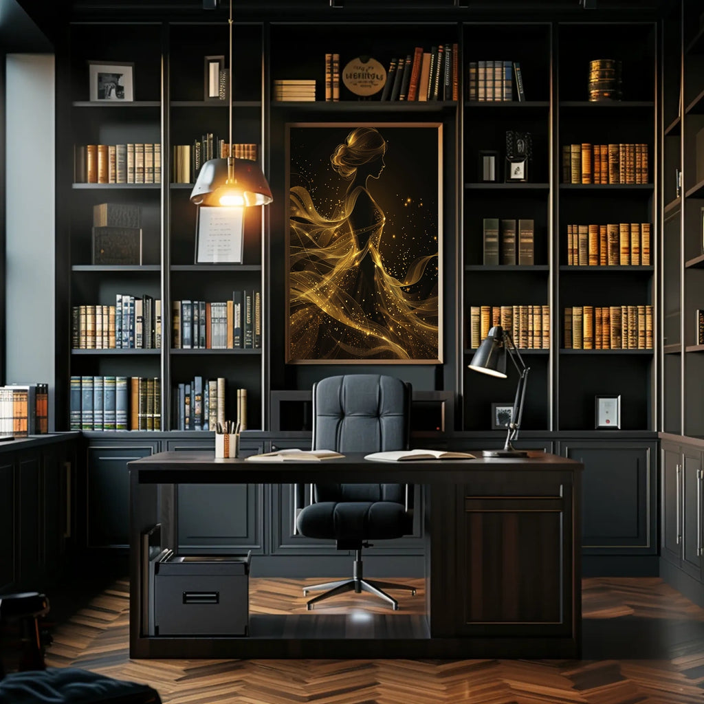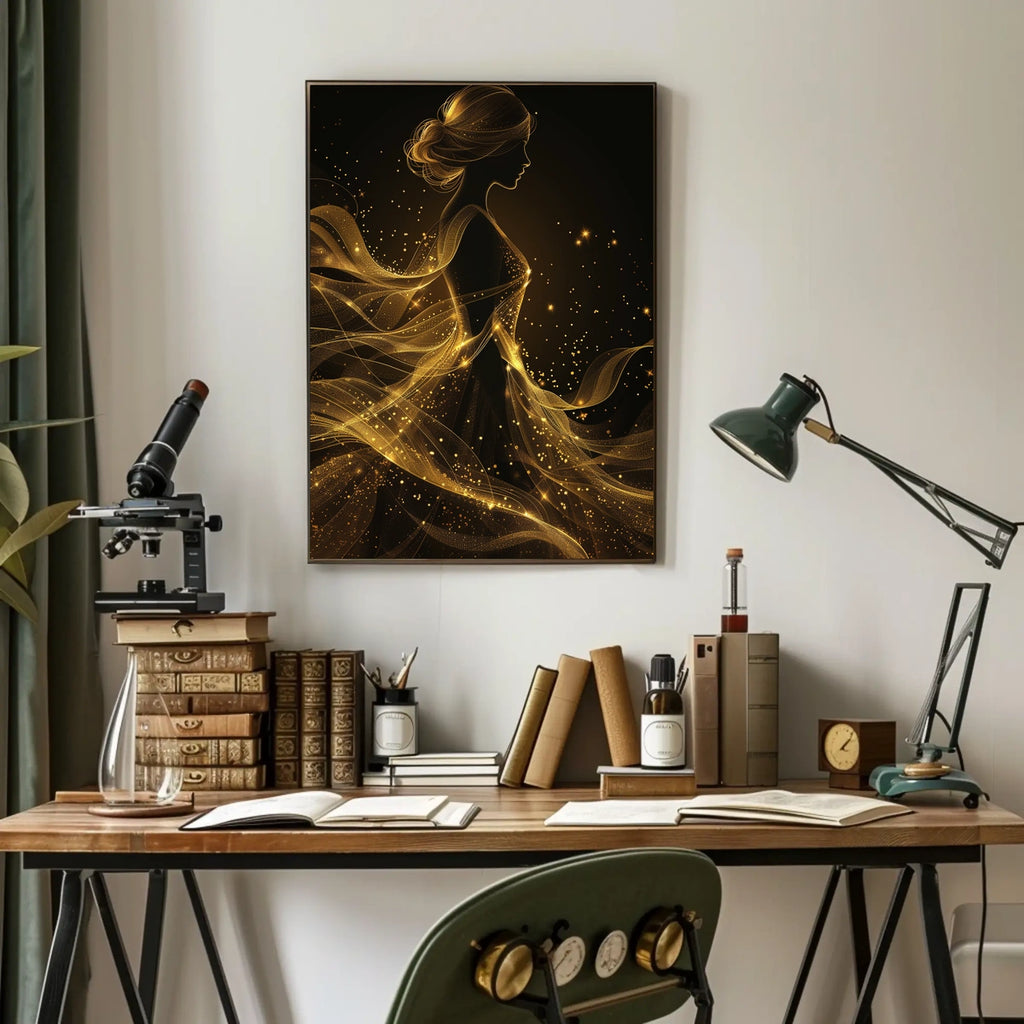 Immerse yourself in the enchanting allure of a mesmerizing silhouette enveloped in flowing, sparkling golden gossamer. This abstract depiction embodies femininity and elegance, set against a mystical, undefined backdrop that evokes an otherworldly realm. The shimmering trails and stardust-like specks of gold accentuate her graceful form, creating a dynamic sense of movement. With its modern, surreal artistic style, it plays with light and shadow to craft a dreamy, celestial atmosphere. Perfect for adding a touch of luxury and sophistication to any space. Ideal for fans of abstract art, celestial decor, and modern surrealism, this piece elevates interiors with a feminine silhouette and radiant gold accents.