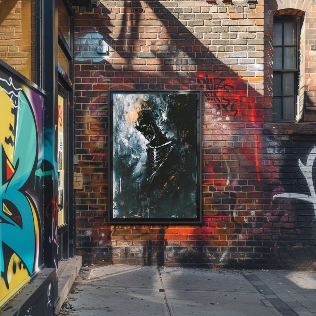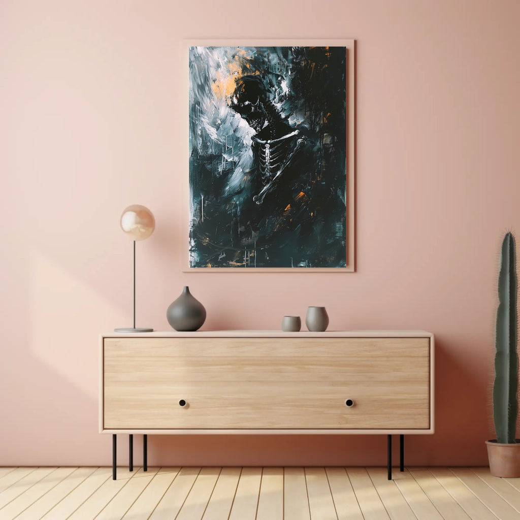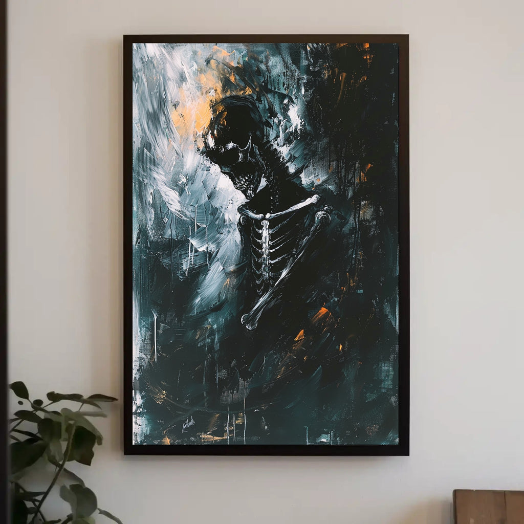Bring a hauntingly beautiful focal point to your space with the Ethereal Skeleton Abstract Art Poster by PosterGoat. This striking contemporary poster blends expressive brushstrokes, bold black-and-white contrasts, and flashes of teal and orange to create an evocative, thought-provoking statement piece for modern decor.