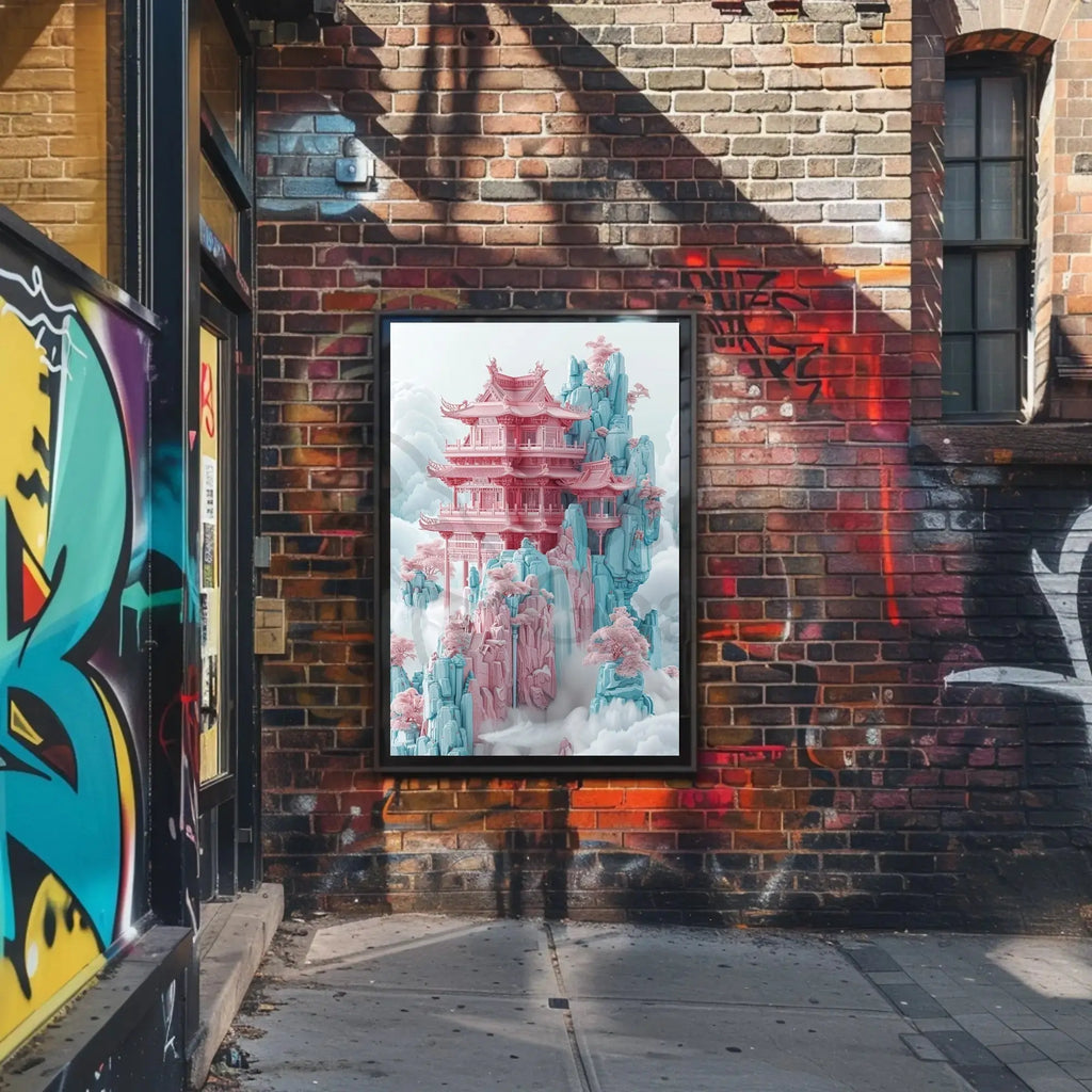 Immerse your space in serene fantasy with the Ethereal Tranquility Fantasy Pagoda Artistic Poster from PosterGoat. This surreal, East Asian–inspired composition features a delicately detailed pagoda perched among pastel turquoise cliffs, drifting clouds and soft pink blossoms — a tranquil scene that blends architectural precision with dreamlike atmosphere.