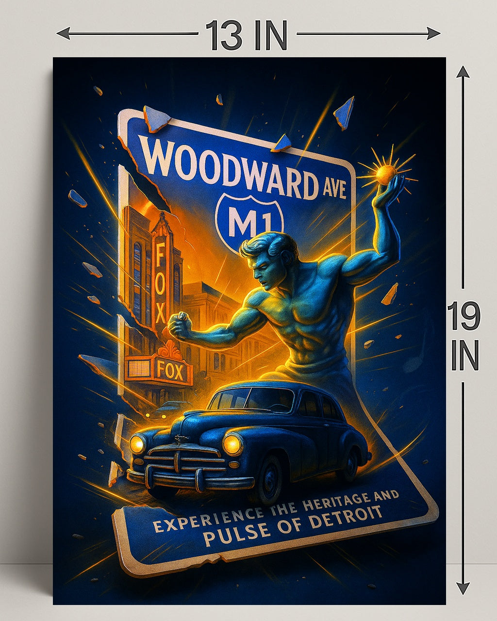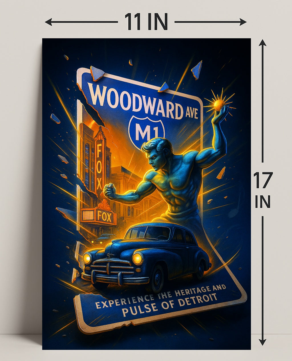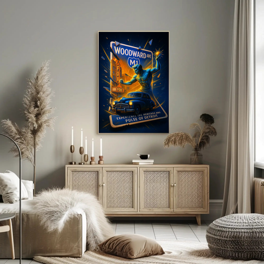 Bring the spirit of Motor City into your home with the "Experience the Heritage and Pulse of Detroit" poster from PosterGoat. This dramatic, minimalist artwork fuses classic Detroit icons — from Woodward Avenue and the Fox Theatre to a vintage automobile and a heroic figure — into a bold visual narrative that celebrates the city's heritage and energy.