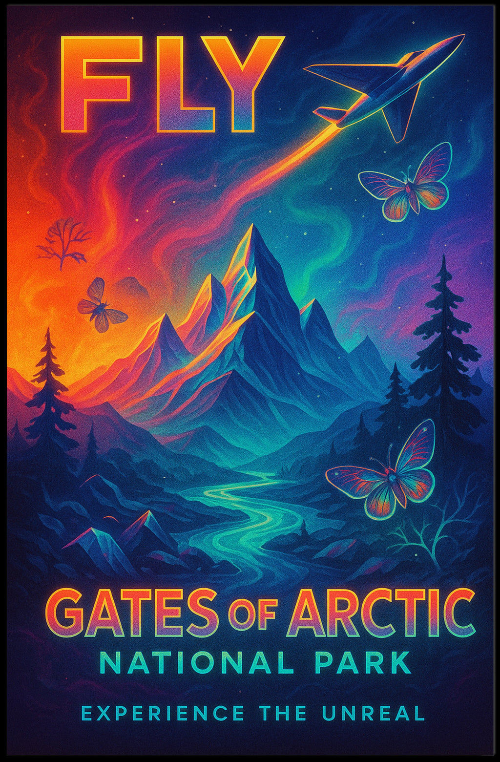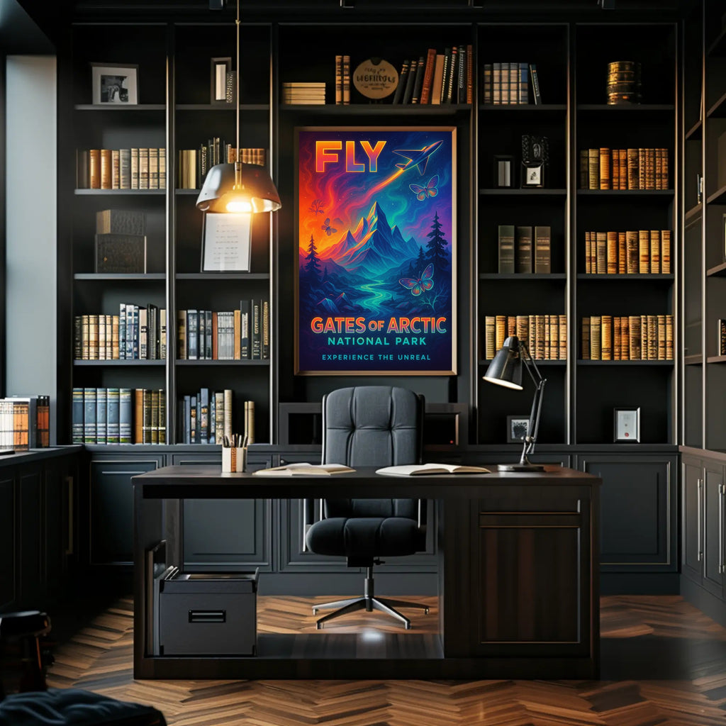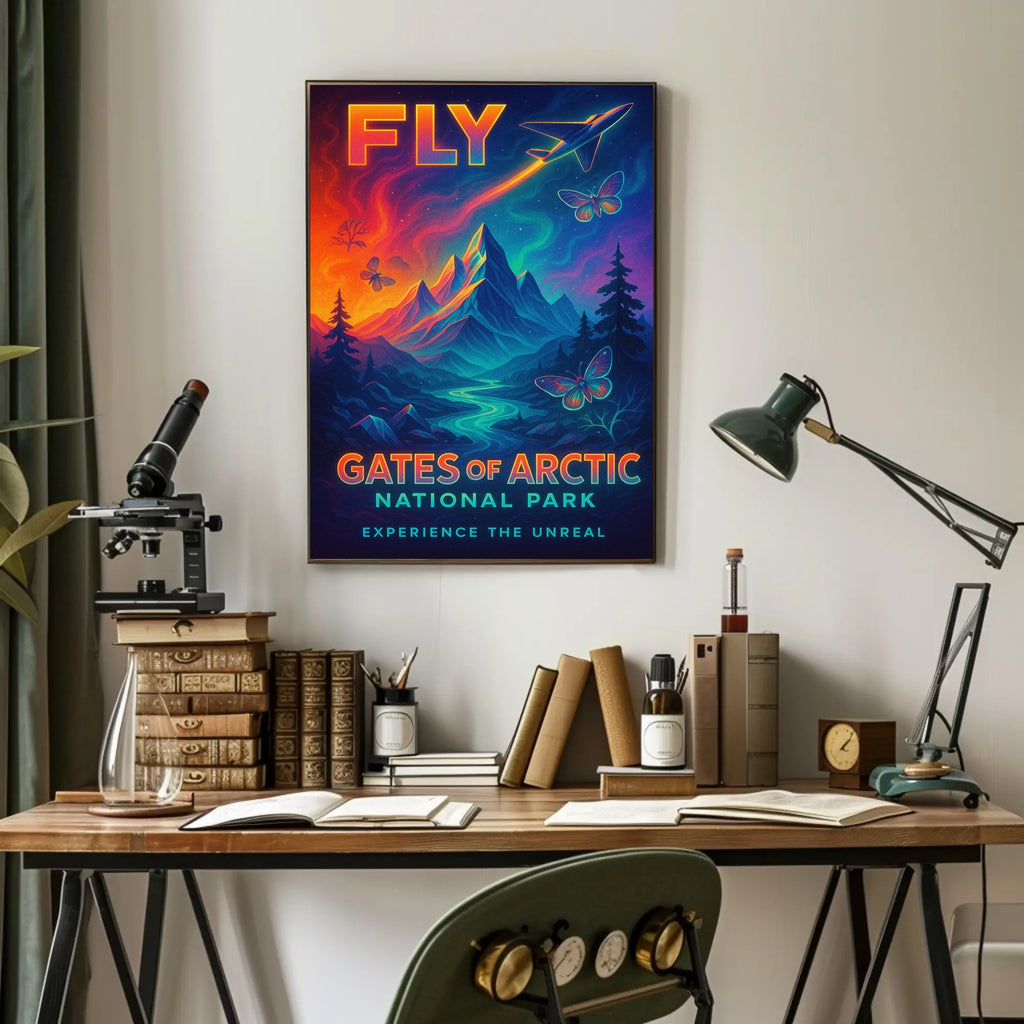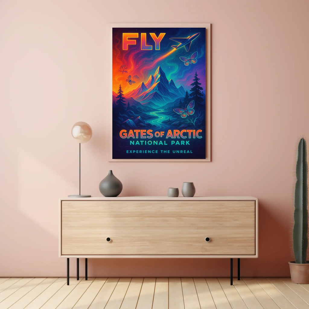 - Eye-catching visuals: Bold neon typography reading "FLY" and "GATES OF ARCTIC" pairs with painterly mountains and an aurora borealis-inspired sky to create a high-impact focal point for any room.