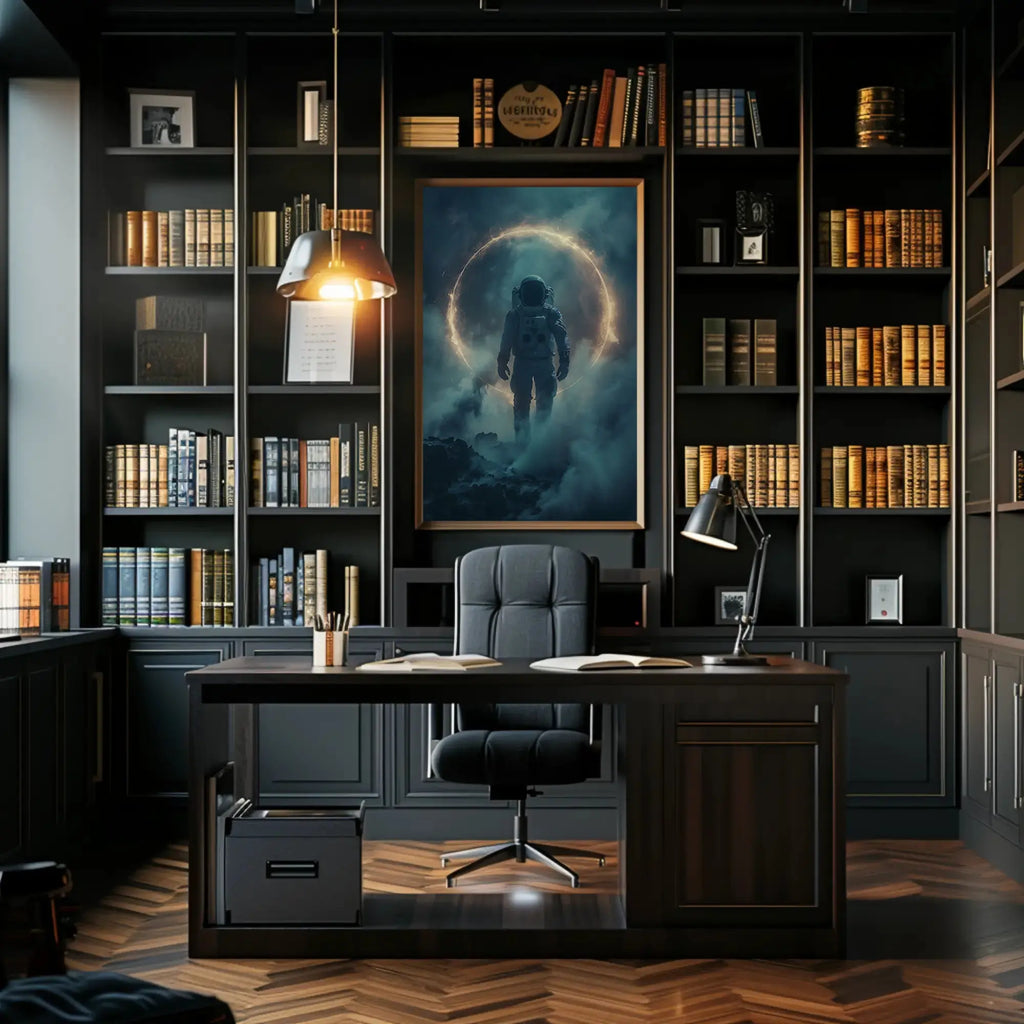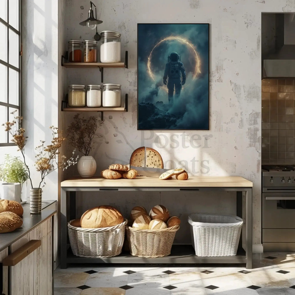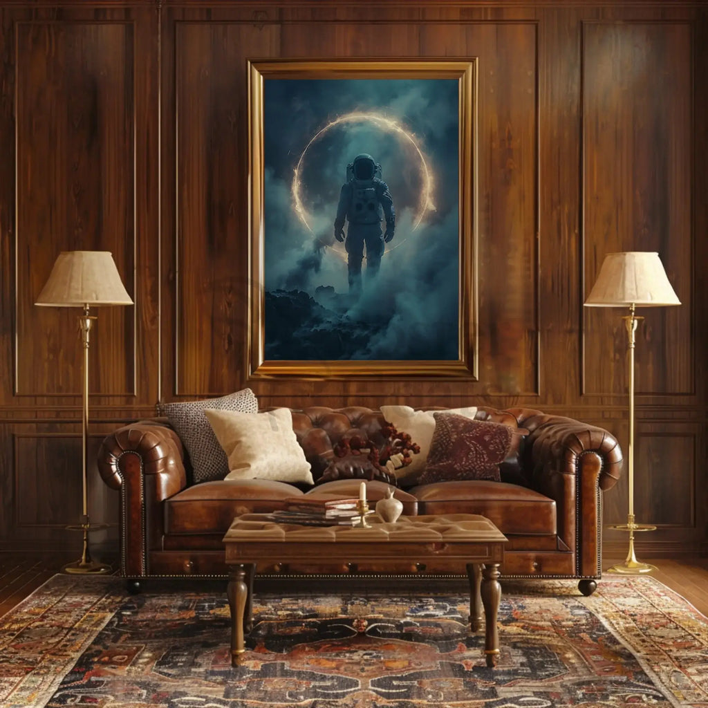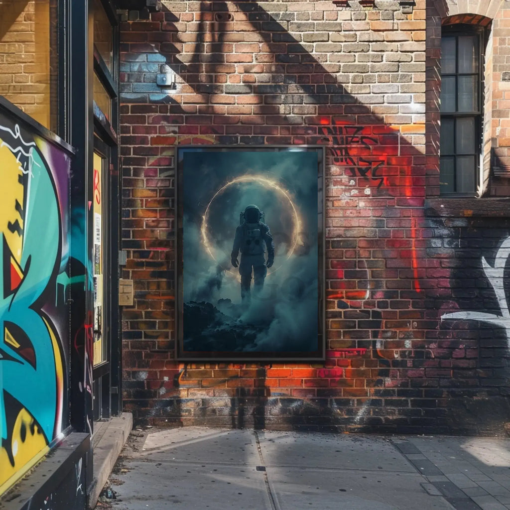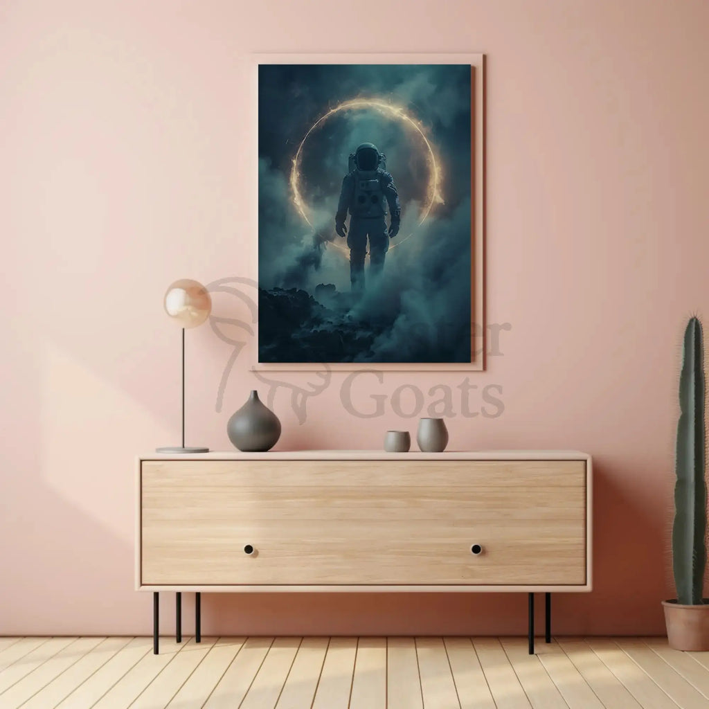 Step into the realm of mystery and wonder with this captivating poster featuring an astronaut on a misty, rocky alien planet. Bathed in deep blues and muted tones, this atmospheric design captures the essence of exploration and the unknown. The intriguing glowing ring behind the astronaut serves as a mystical portal, inviting viewers into a surreal world where light and shadow play harmoniously. Perfect for those who are fascinated by space and the concept of discovery, this poster is a striking addition to any room, sparking curiosity and imagination.