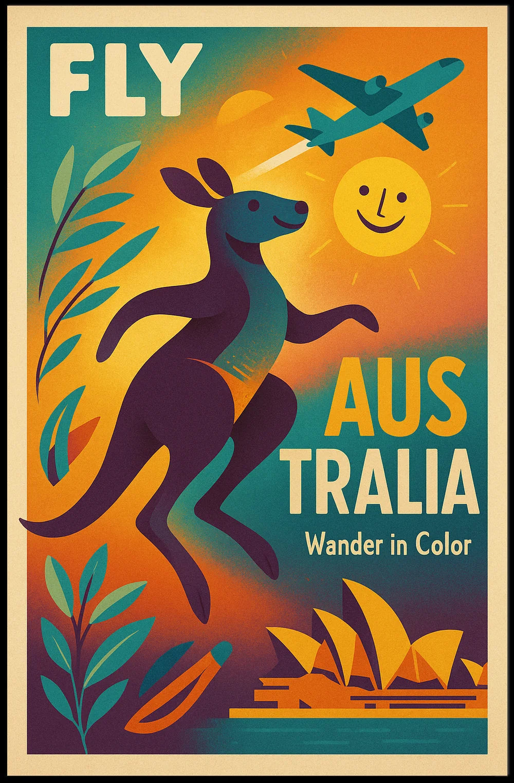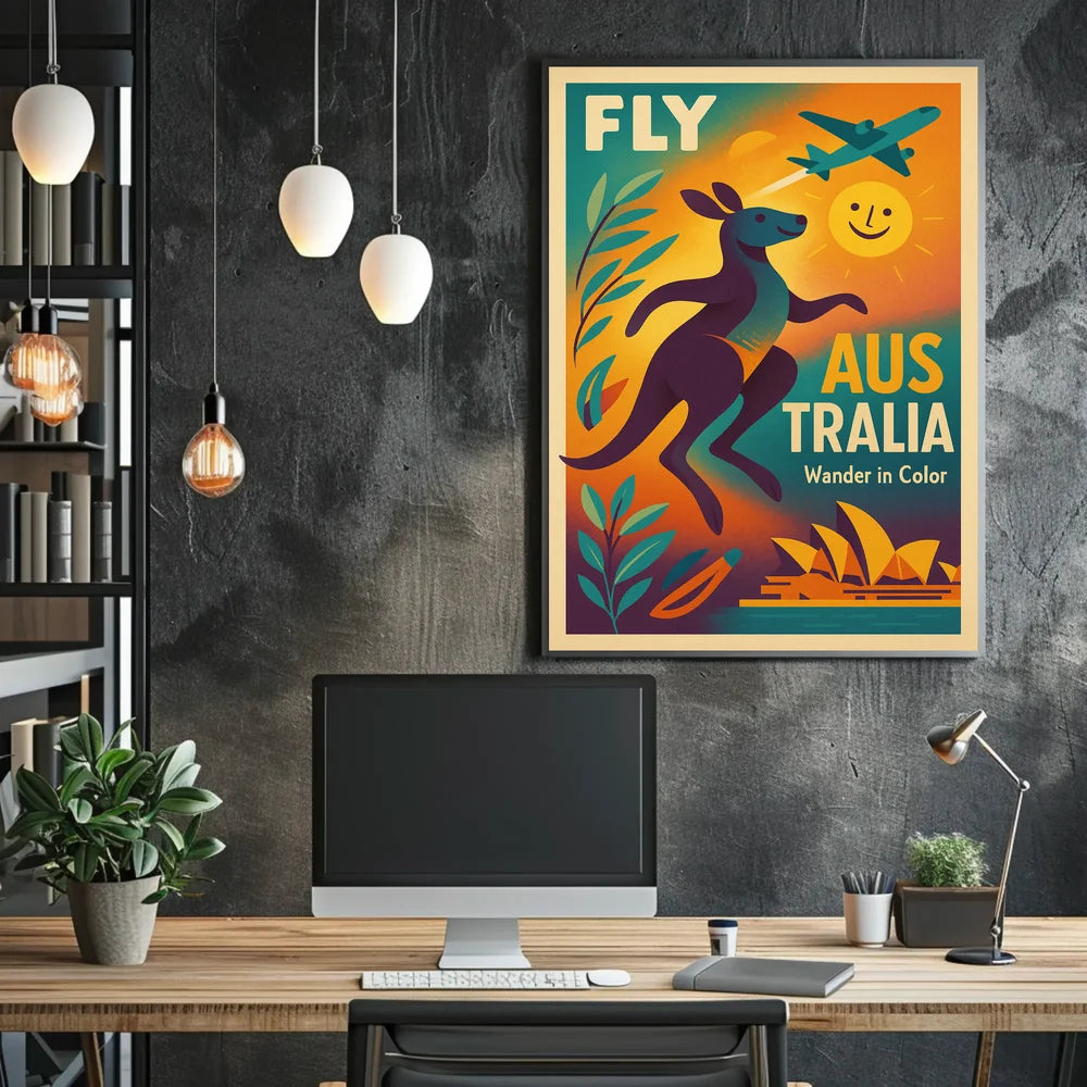 Experience the thrill of travel with this dynamic poster showcasing Australia's iconic charm. A playful kangaroo takes center stage, surrounded by the vibrant hues of orange, teal, and green, while a stylized airplane soars toward a smiling sun, inviting viewers on a joyful journey. The backdrop features the world-renowned Sydney Opera House, enhancing the poster's allure with a touch of cultural recognition. This modern, illustrative artwork evokes an adventurous spirit, encouraging exploration and wanderlust. Perfect for travel enthusiasts, it promises excitement and positivity, captured in its inspiring tagline “Wander in Color.”