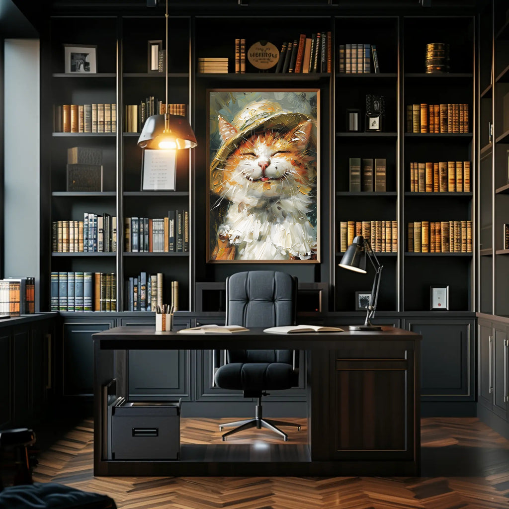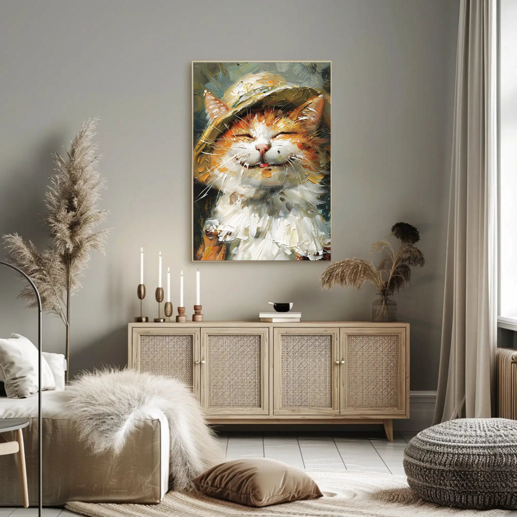Add a smile to your walls—order the Expressive Cat in Hat Artistic Animal Poster from PosterGoat today and transform your space with joyful, colorful wall art.