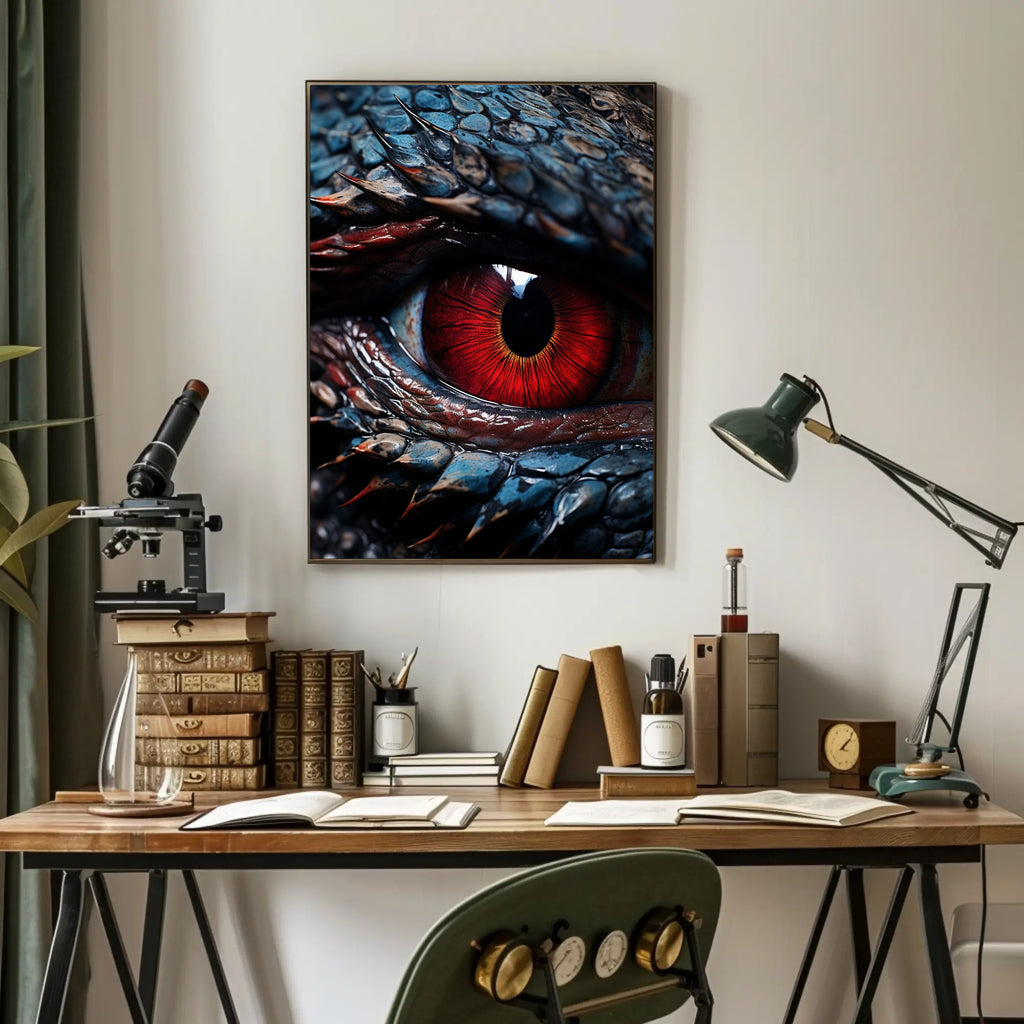 Bring an intense focal point to your room with the Eye Of The Dragon Poster from PosterGoat — a striking close-up poster that captures the molten-red iris, razor-sharp scales and glossy, hyper-detailed texture of a mythical dragon's eye. Perfect for fans of fantasy art, minimalist interiors and dramatic wall art that sparks conversation.