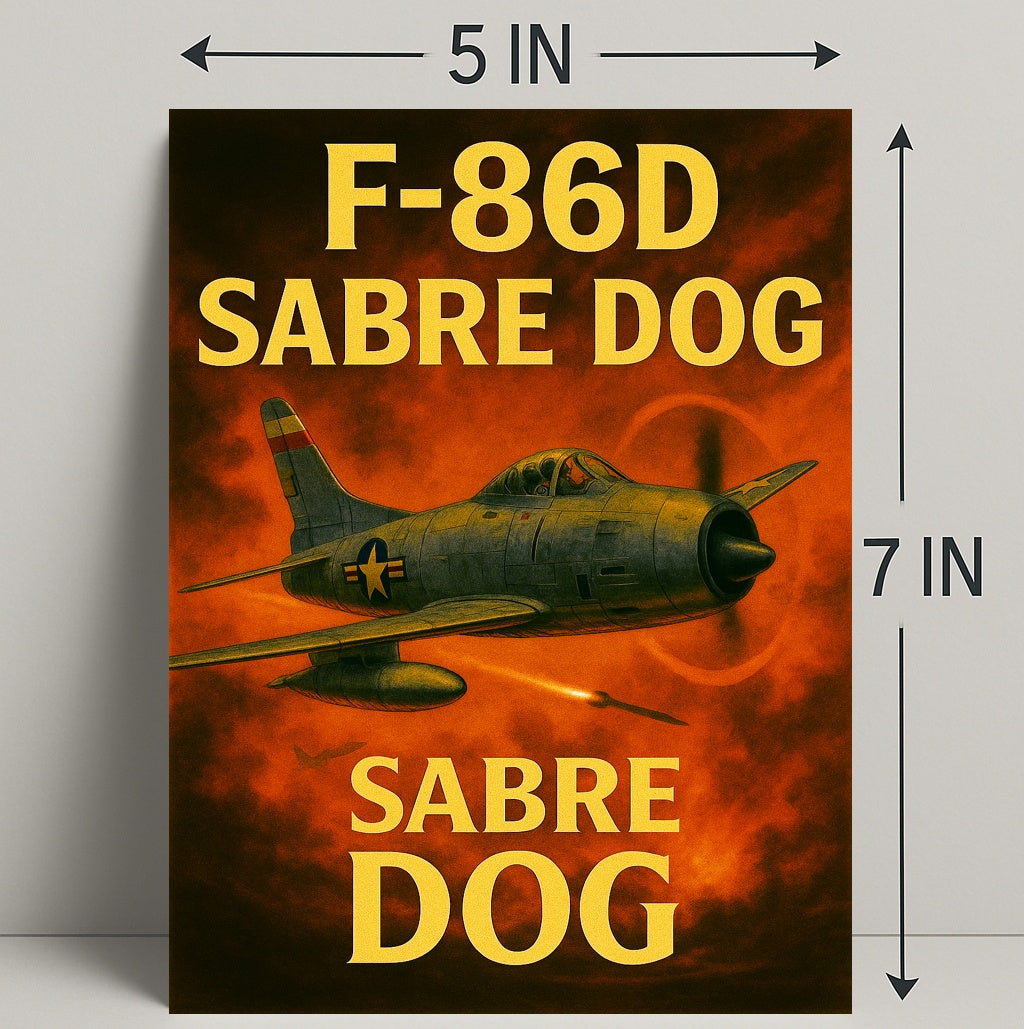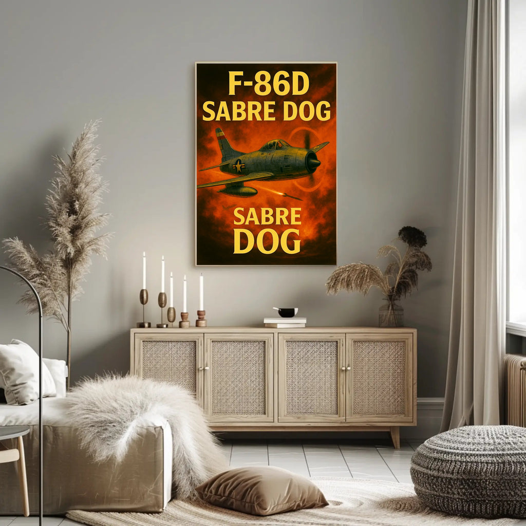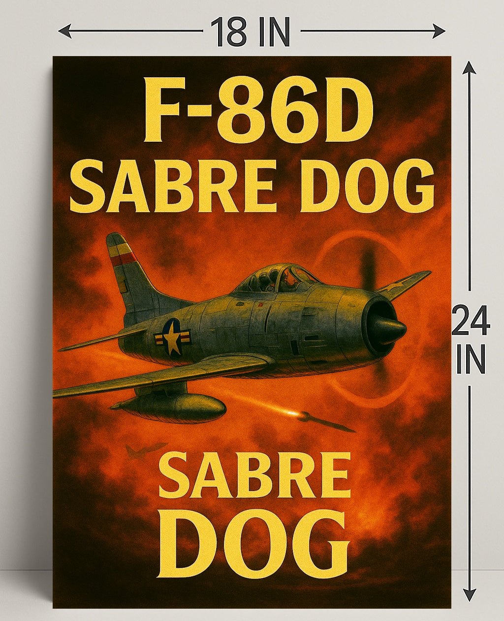 The poster features a detailed illustration of the F-86D Sabre Dog cutting through a stormy, flame-toned sky; powerful propeller motion, realistic panel shading and a classic U.S. star insignia create an authentic, nostalgic look while oversized, golden type reads F-86D SABRE DOG for instant visual impact.