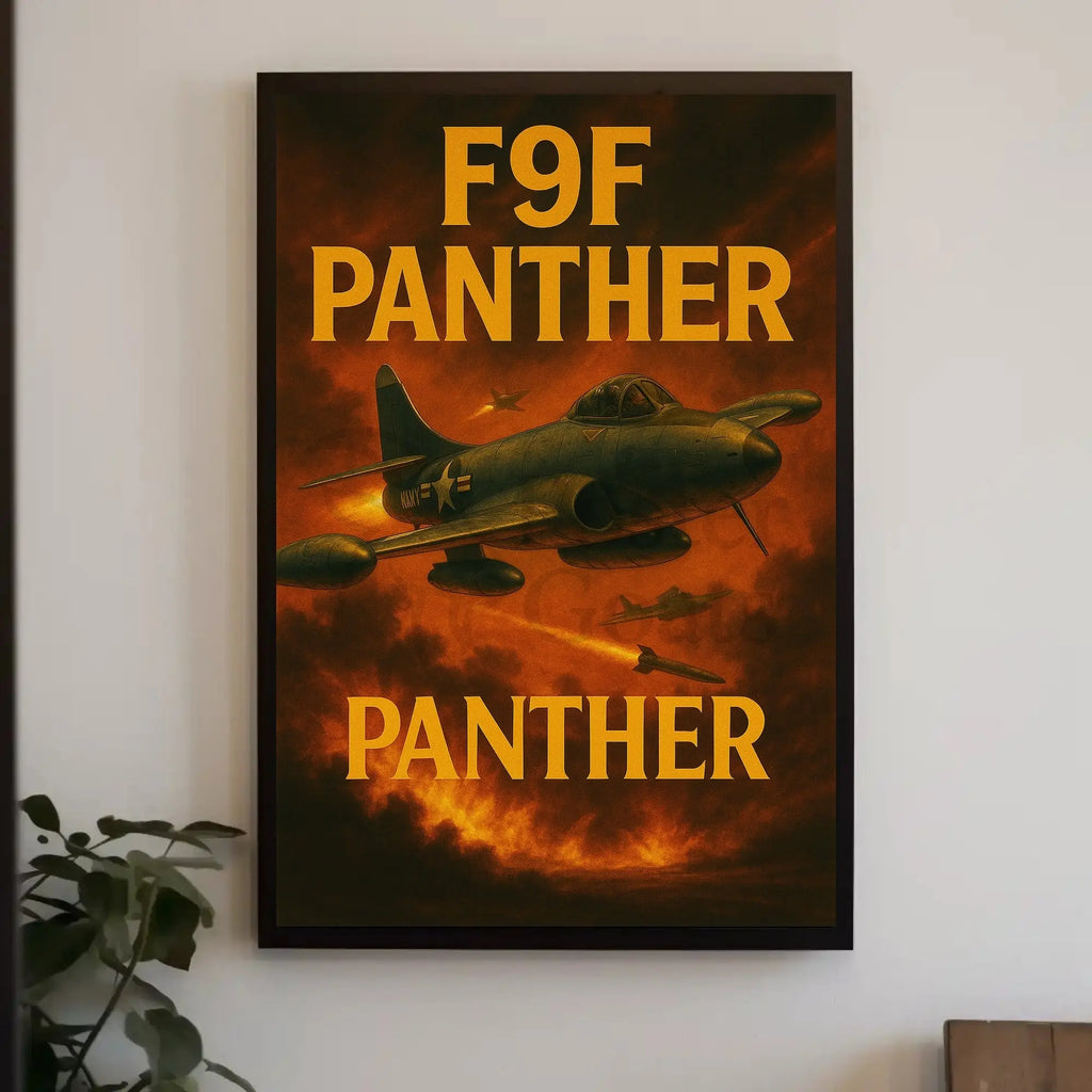 - Striking visual impact: Deep orange and amber clouds highlight the Panther’s silhouette while large, vintage typography (“F9F PANTHER”) anchors the composition for instant wall presence.
