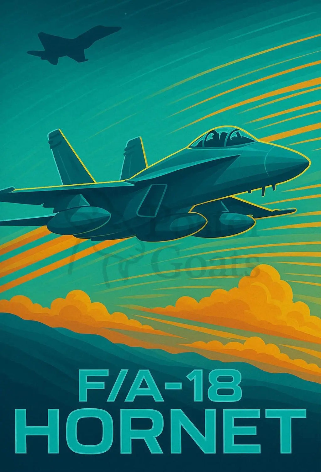 Bring the roar of supersonic flight into your space with the F/A-18 Hornet Fighter Jet Poster from PosterGoat. This modern art print captures the jet in a dynamic, mid-century-inspired composition — bold speed lines, a dramatic jet silhouette, and vibrant teal and orange contrasts that create a powerful, energetic mood perfect for aviation enthusiasts and contemporary decor lovers.