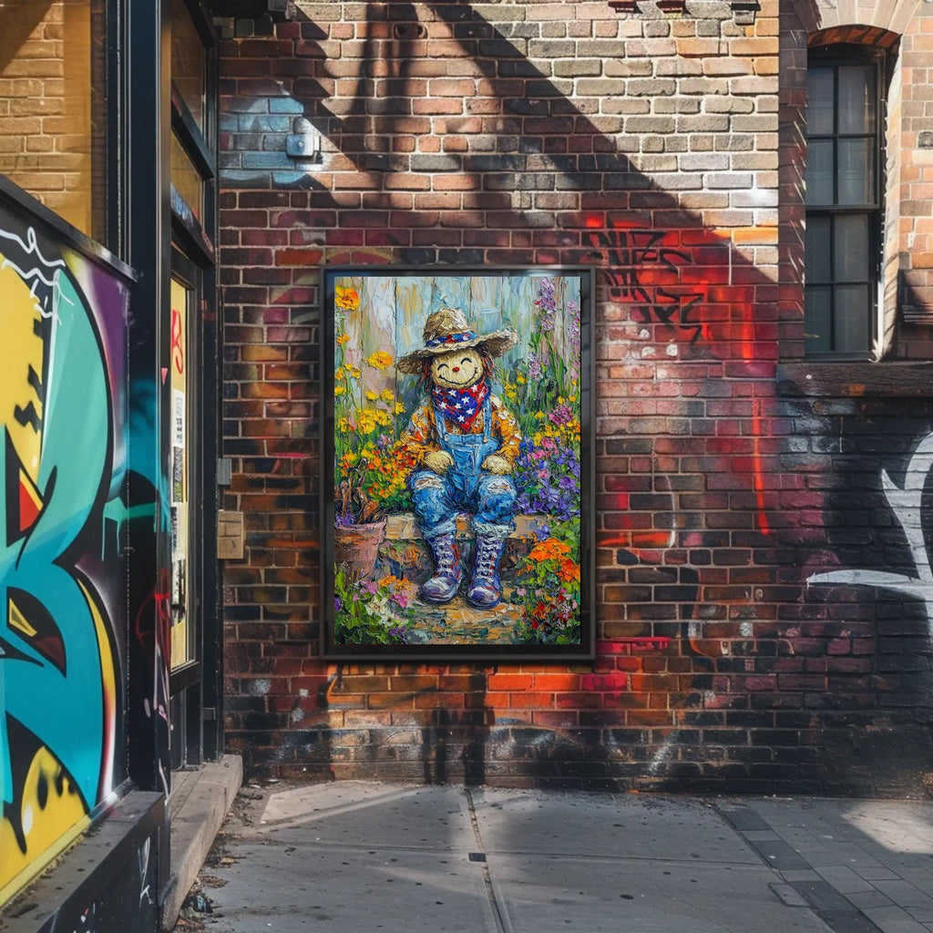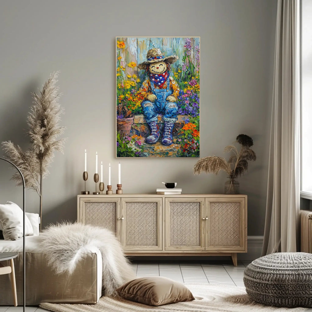 Brighten any room with the family garden in full bloom poster—a cheerful art print that showcases a smiling scarecrow perched among a lush bed of flowers. This bold yet timeless piece is rendered in a vivid painterly style that feels both classic and fresh, making it a welcoming addition to any home decor.