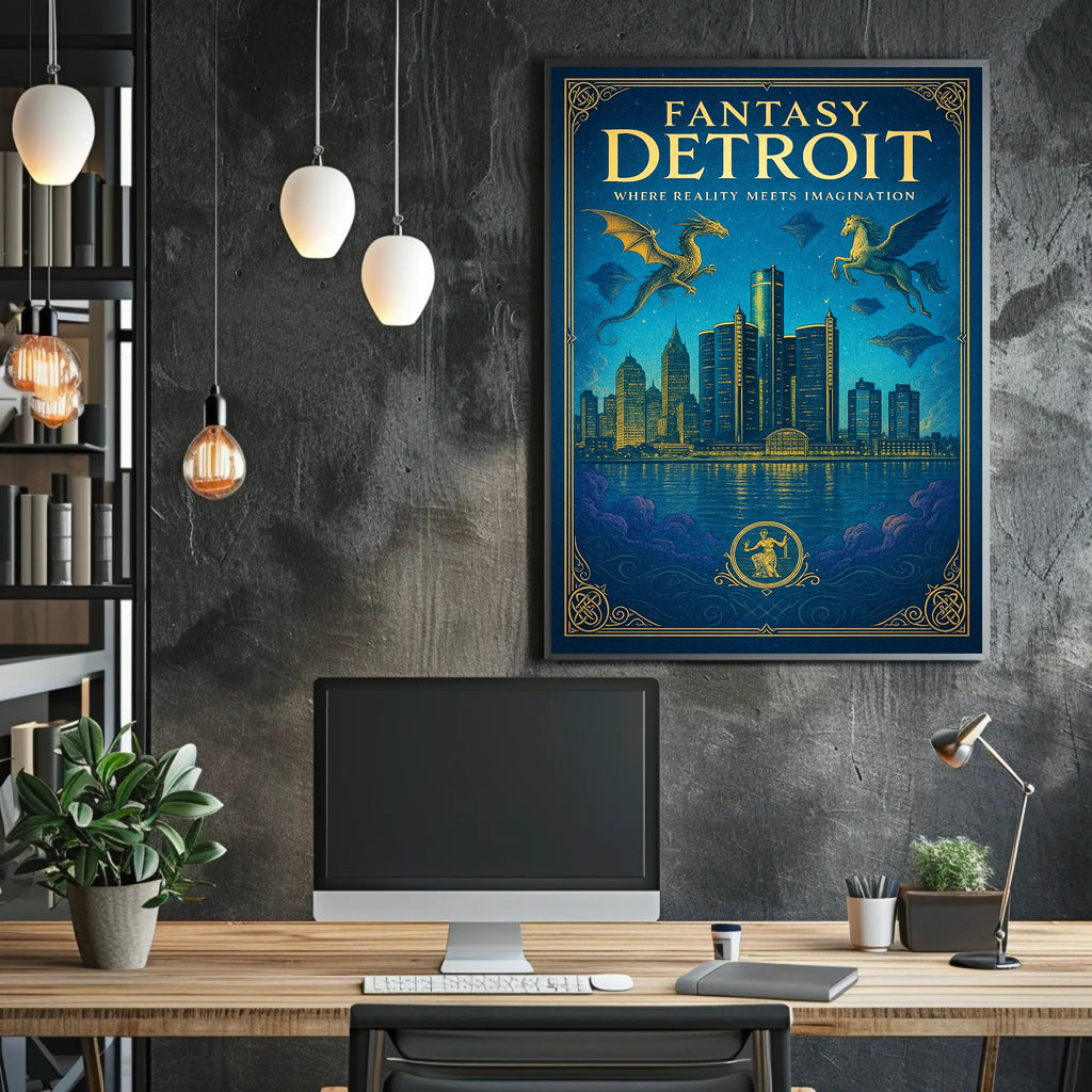 Whether you're decorating a cozy apartment or curating a themed gallery wall, this Fantasy Detroit Poster transforms everyday space into a place where reality meets imagination. Add it to your collection today and let your walls tell a story.