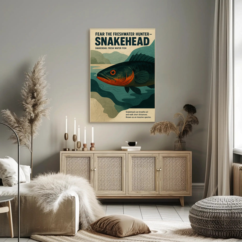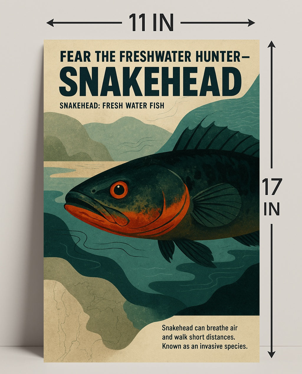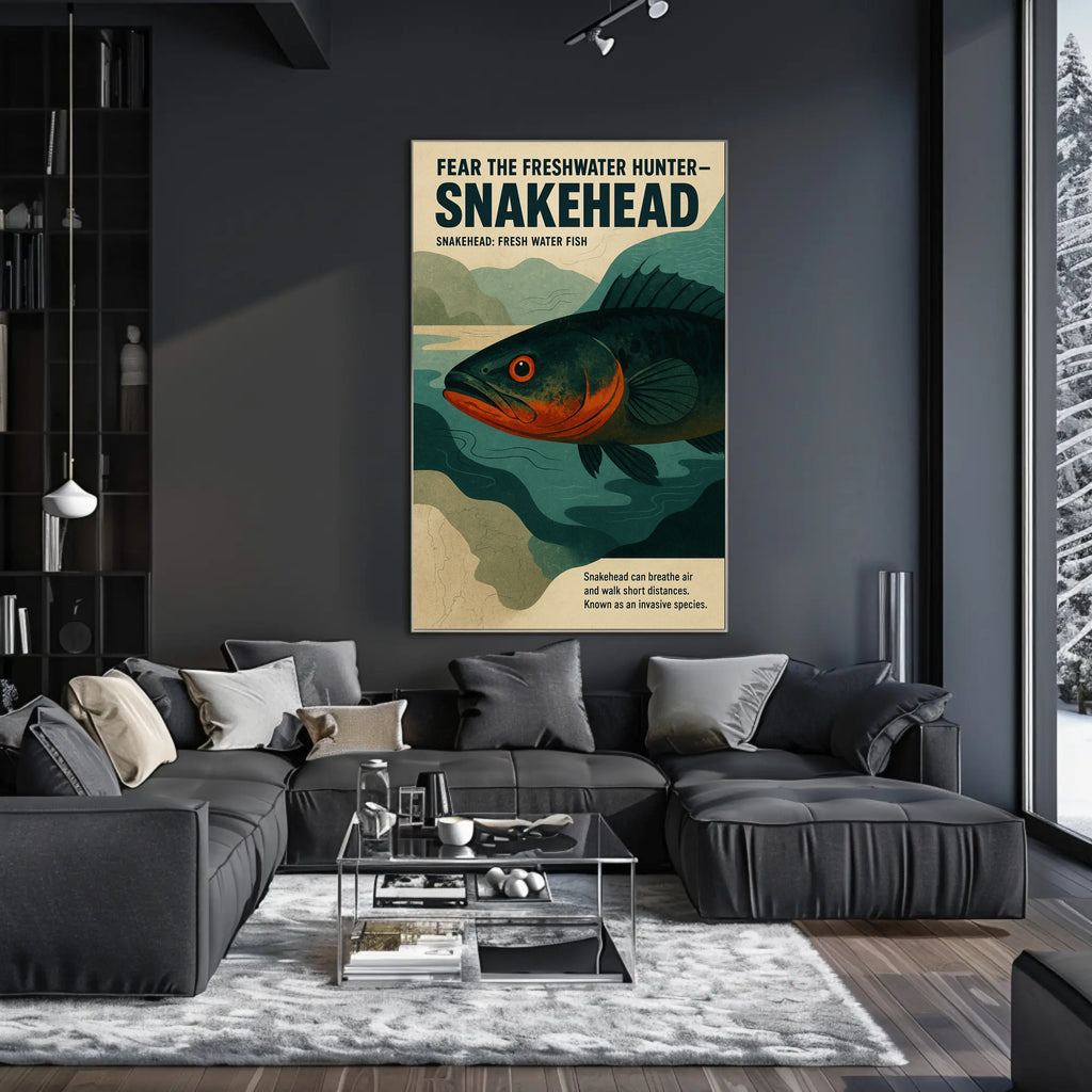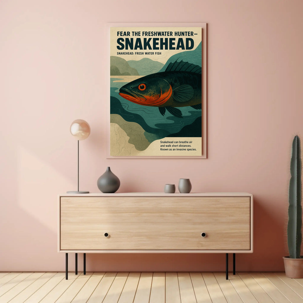 Educational accent: Subtle copy at the bottom calls out the snakehead’s unusual traits — it can breathe air and even move on land for short distances — making this poster both decorative and conversation-starting.