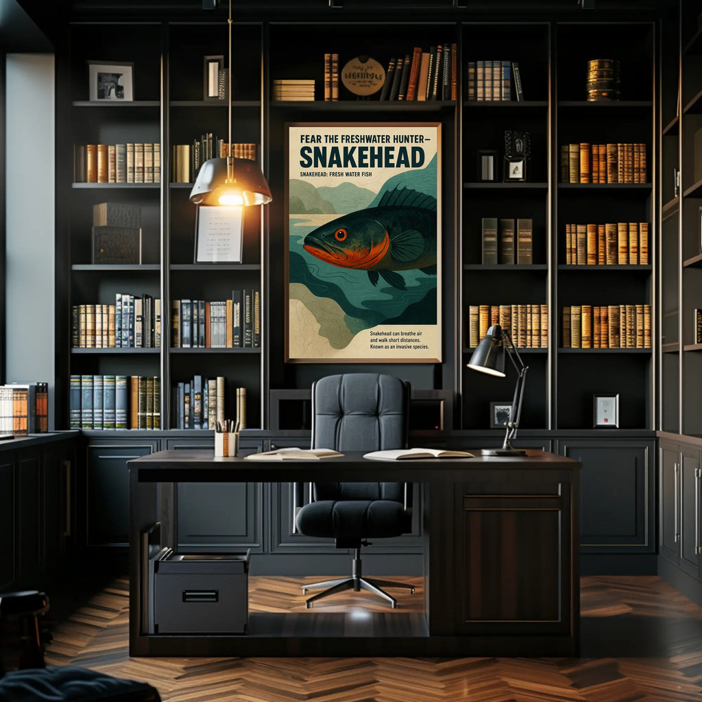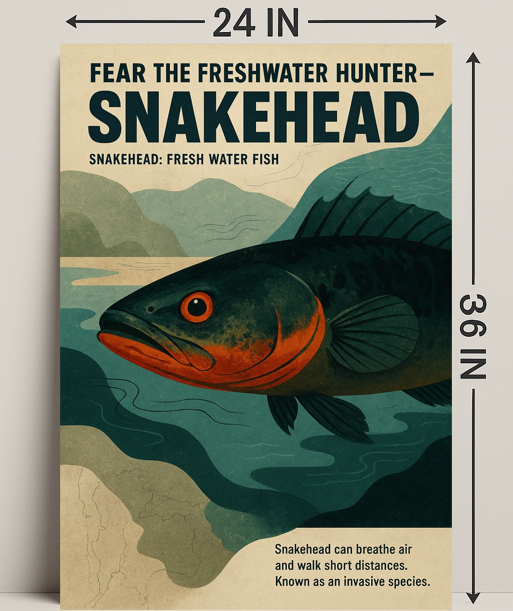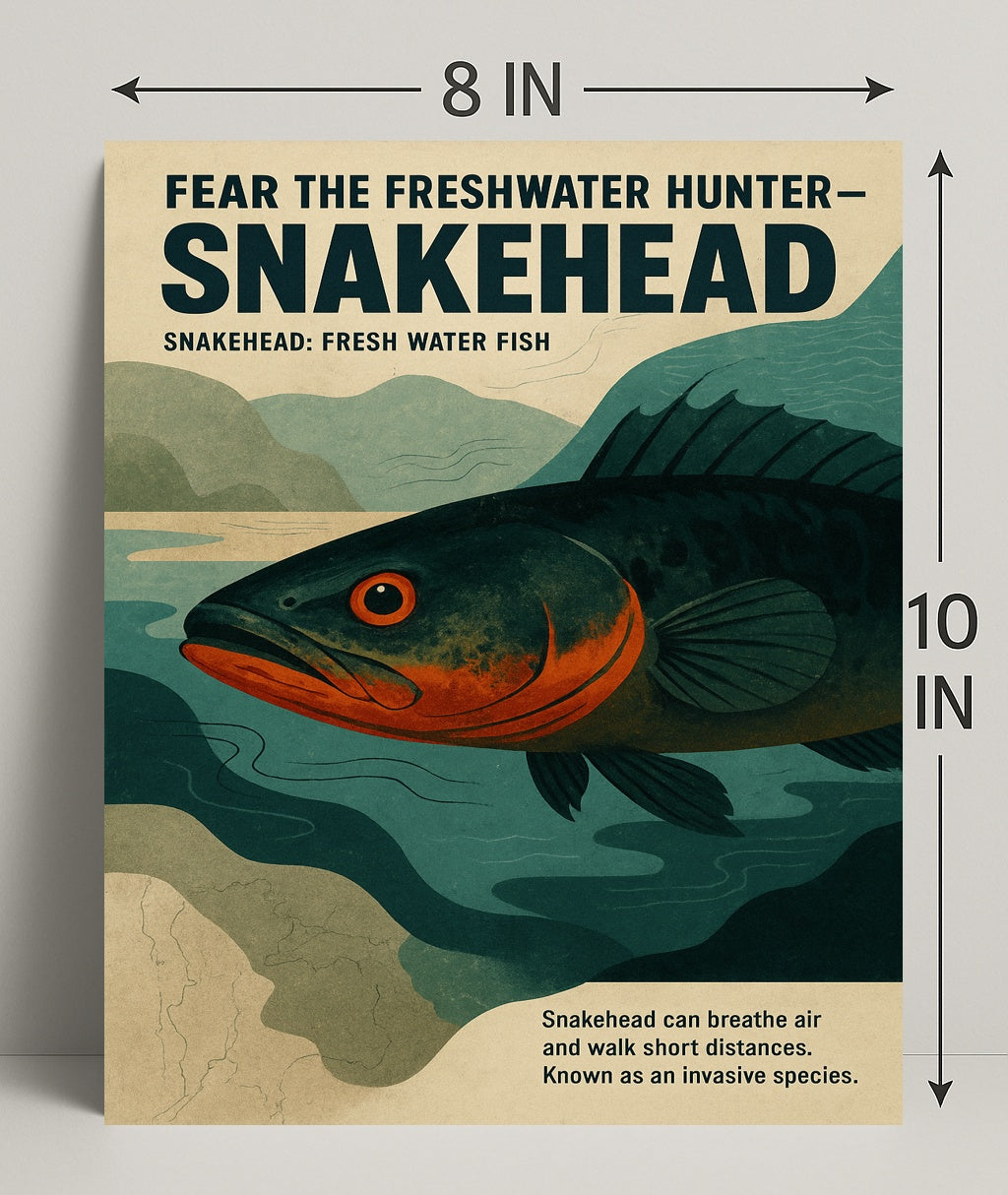 Educational accent: Subtle copy at the bottom calls out the snakehead’s unusual traits — it can breathe air and even move on land for short distances — making this poster both decorative and conversation-starting.