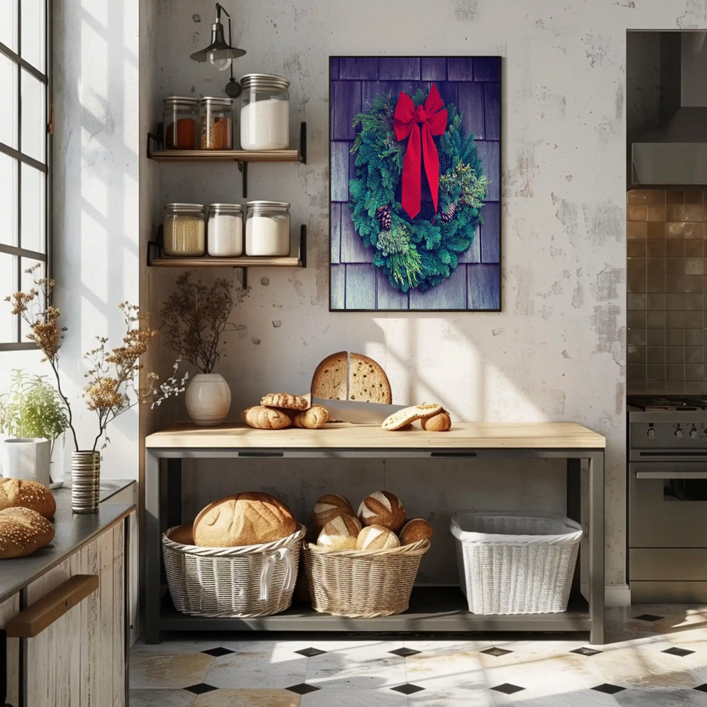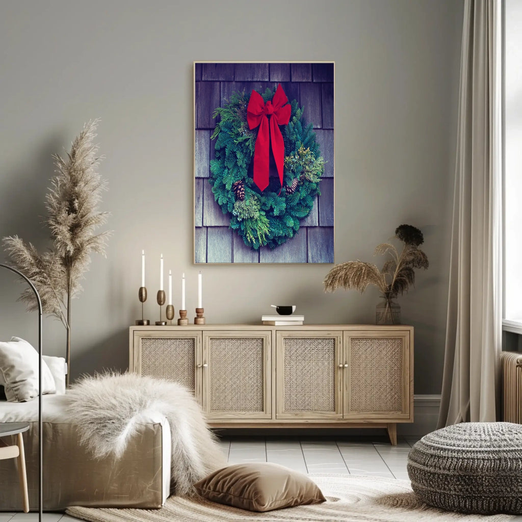 At its heart lies a lush green wreath adorned with an eye-catching red ribbon, symbolizing festive joy and warmth. Pinecones, evergreen branches, and subtle hints of berries create a rich tapestry of natural elements, evoking traditional holiday aesthetics. This artwork blends vibrant colors with intricate details, making it an inviting addition to any festive decor.