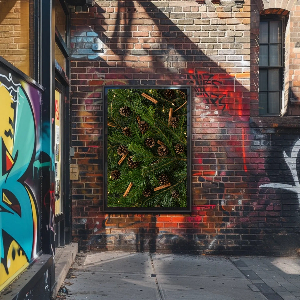 Immerse yourself in the texture and earthy tones of evergreen branches, pine cones, and cinnamon sticks, arranged against the glow of tiny twinkling lights. This Christmas art is designed for those who appreciate a natural style and traditional decor with a contemporary twist. It's perfect for adding a cozy atmosphere to any space.