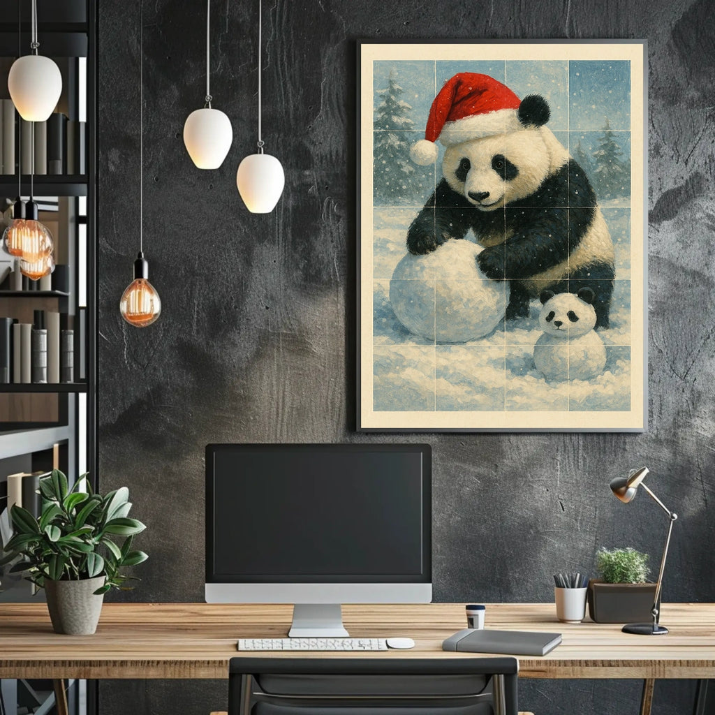 Vivid, scenic design inspired by real-world winter landscapes, featuring a festive panda that adds whimsy and charm to any room.