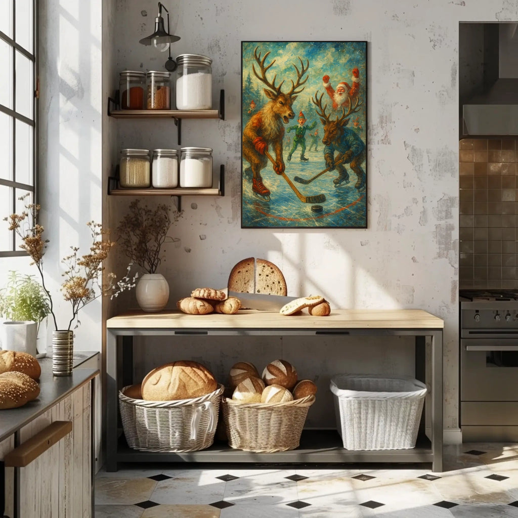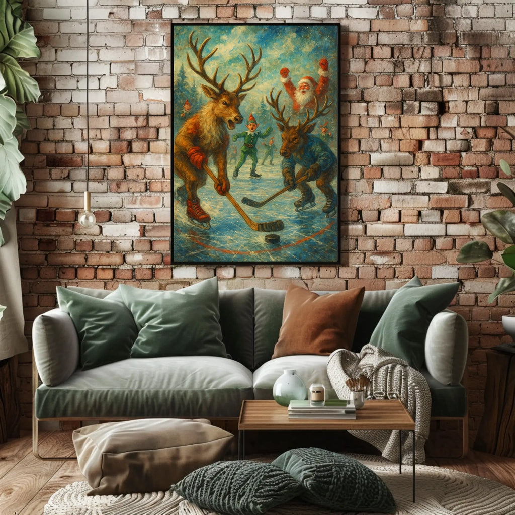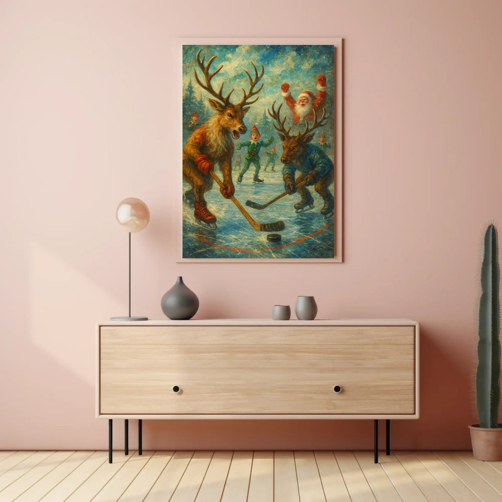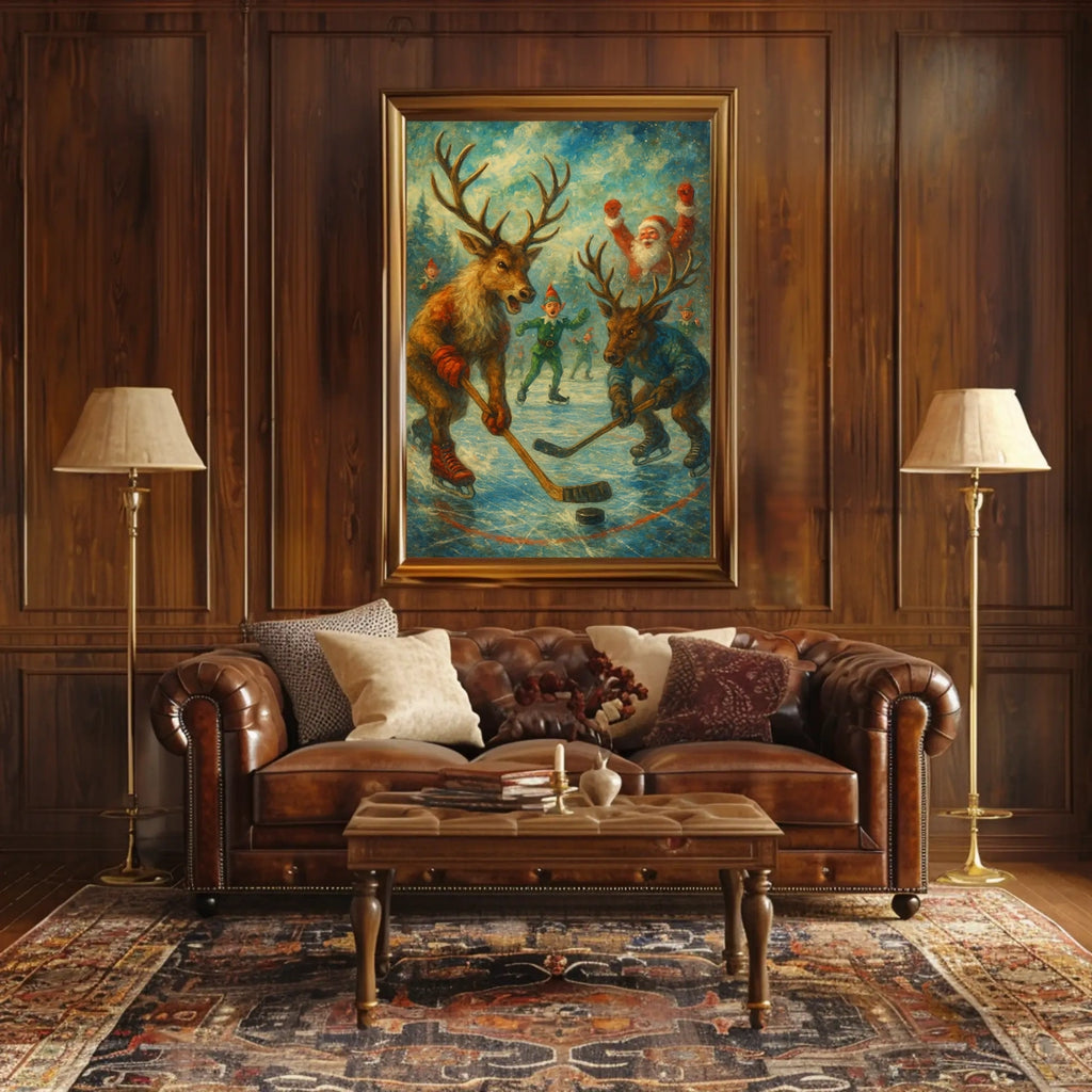 Set in a winter wonderland, it features two reindeer clad in vibrant red and blue hockey gear as they glide across the ice in an exciting match. Santa Claus cheers from the sidelines, surrounded by elves in festive attire, while painterly textures and nostalgic hues echo the warmth of classic holiday illustrations. It's a piece that blends cheer and creativity to celebrate the spirit of the season.