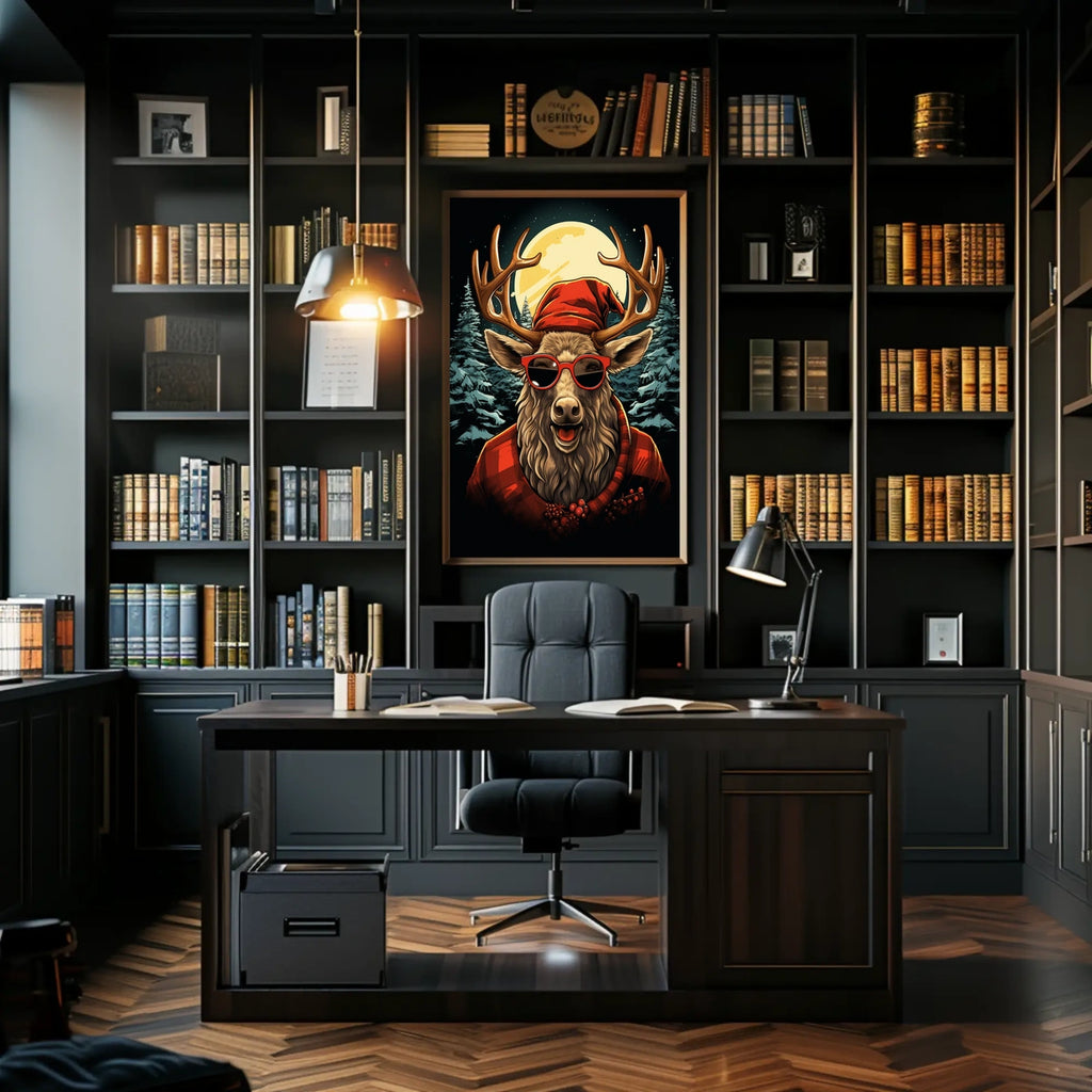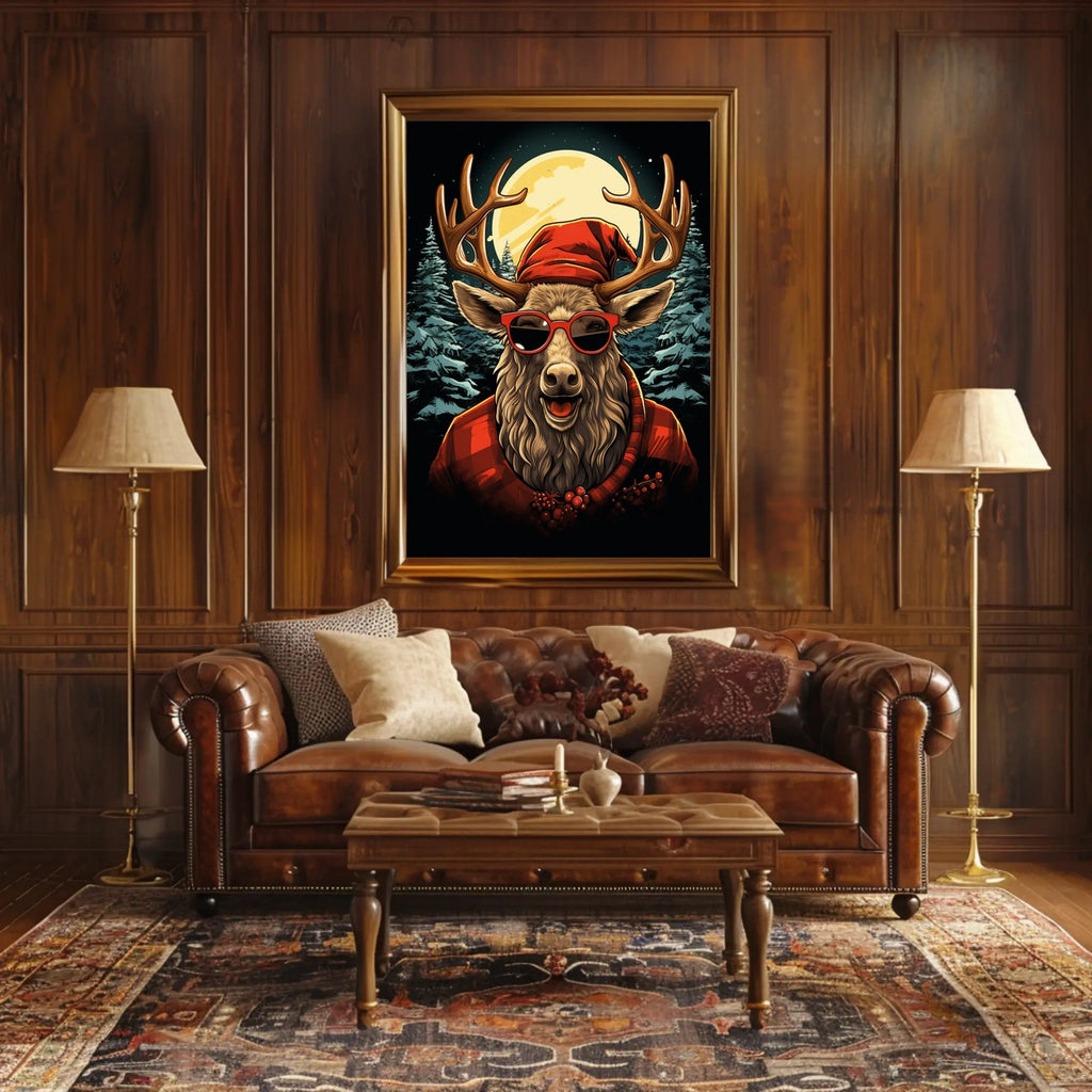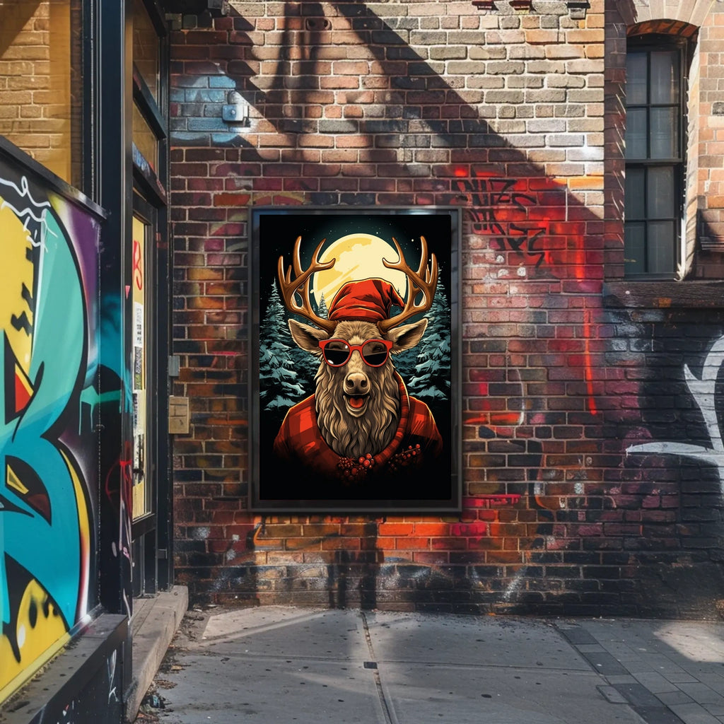 This captivating poster features an anthropomorphic reindeer adorned with a trendy Santa hat and stylish red sunglasses, adding a playful twist to classic holiday aesthetics. Set against a serene nighttime forest, the reindeer is surrounded by snow-laden evergreen trees and illuminated by a brilliant full moon, creating a serene winter ambiance. The bold lines and vibrant reds and blues of the cartoon-style illustration enhance its joyful and whimsical mood. Ideal for holiday-themed decor, this poster effortlessly merges festive cheer with modern flair, making it a unique artistic addition to any space.
