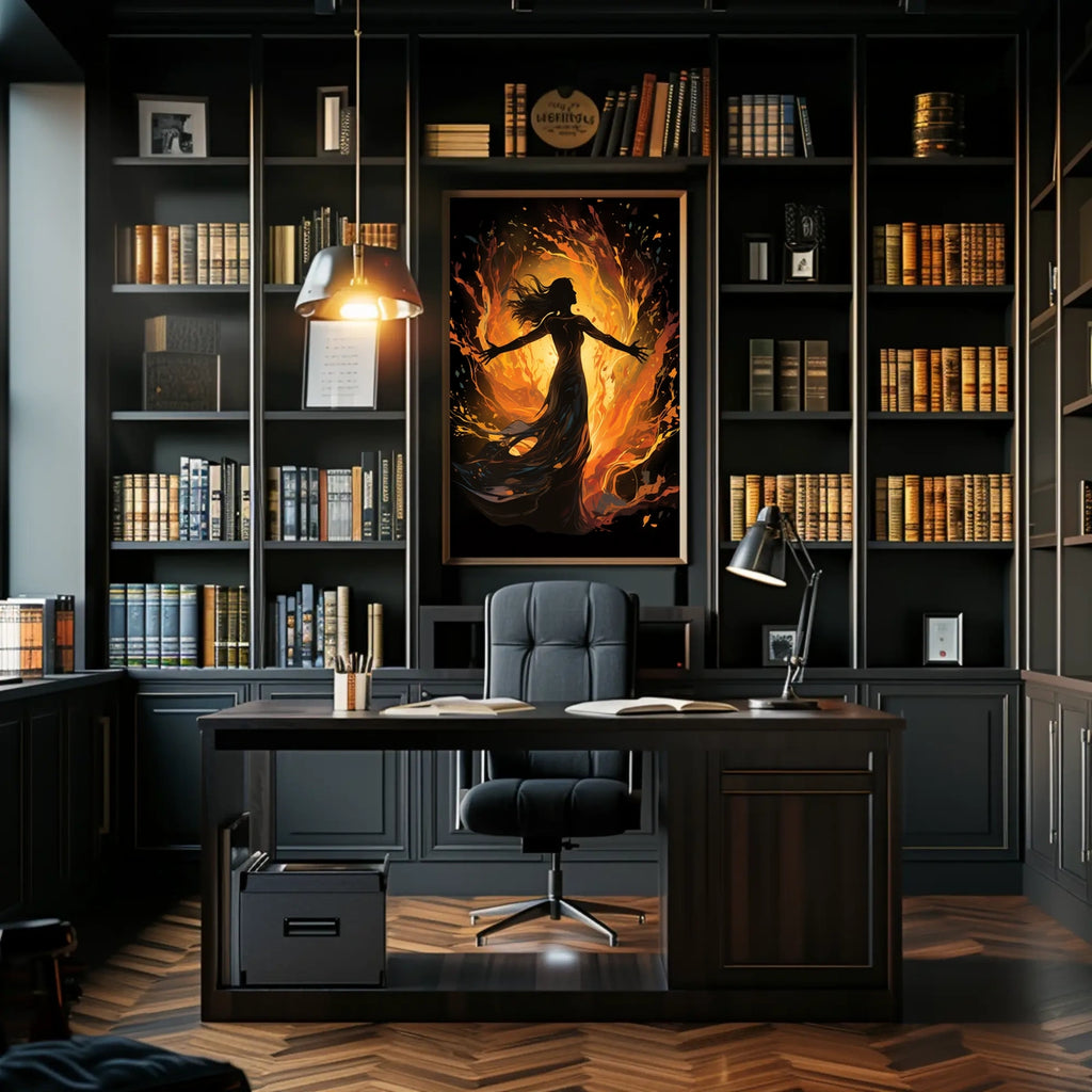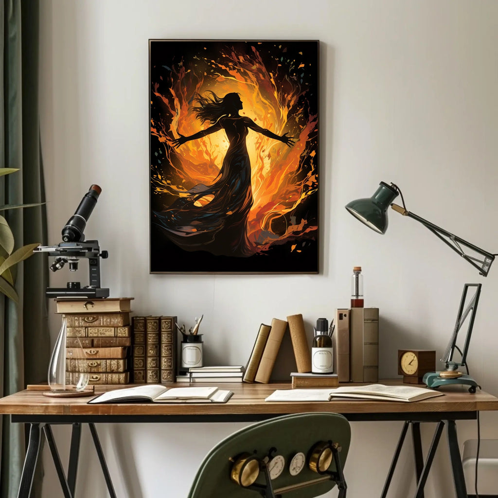 This contemporary poster blends abstract art with artistic empowerment, featuring a dramatic illustration of a woman silhouette amid swirling flames. The piece conveys dynamic energy and elemental force, making it a standout statement for lovers of fantasy and empowerment themes.