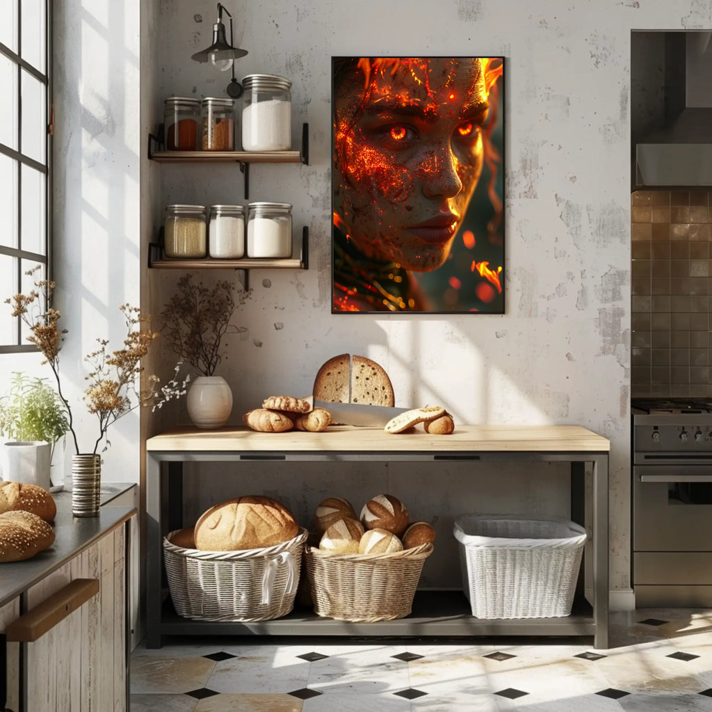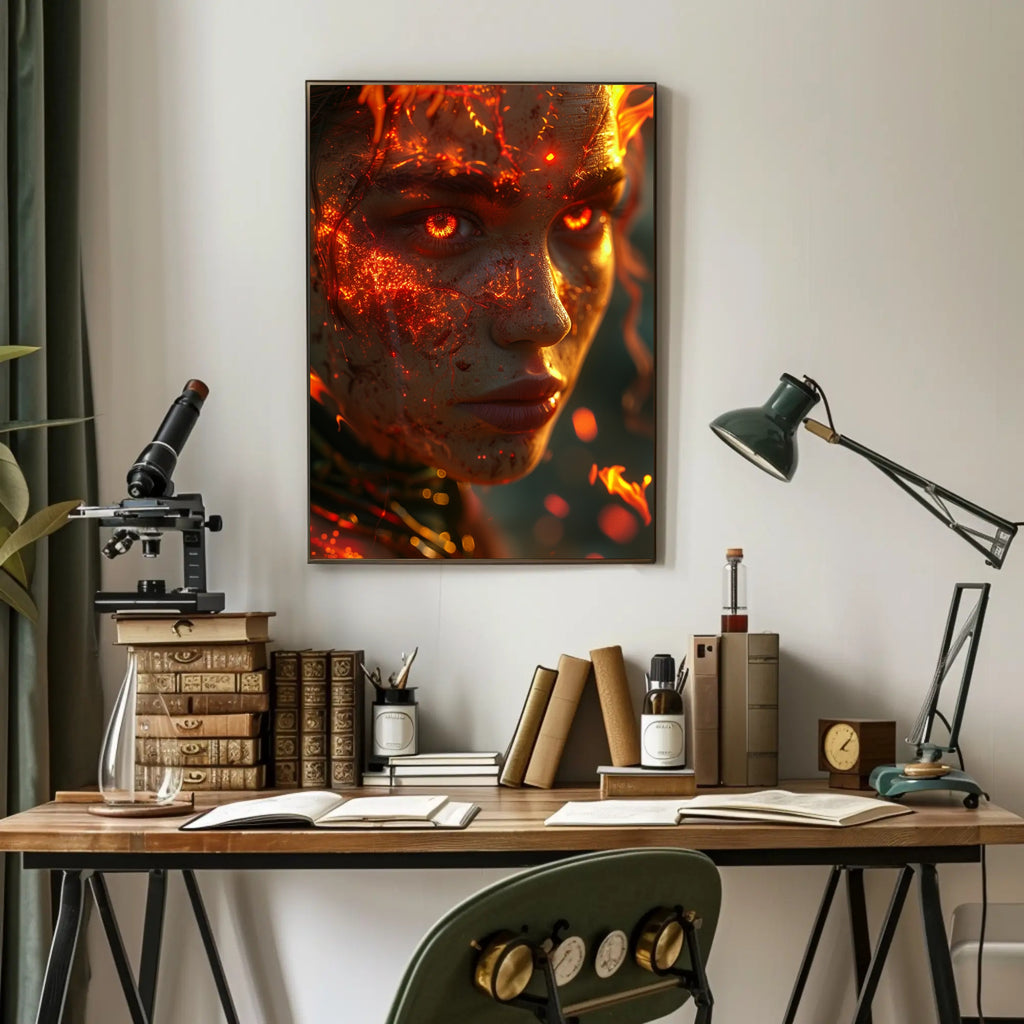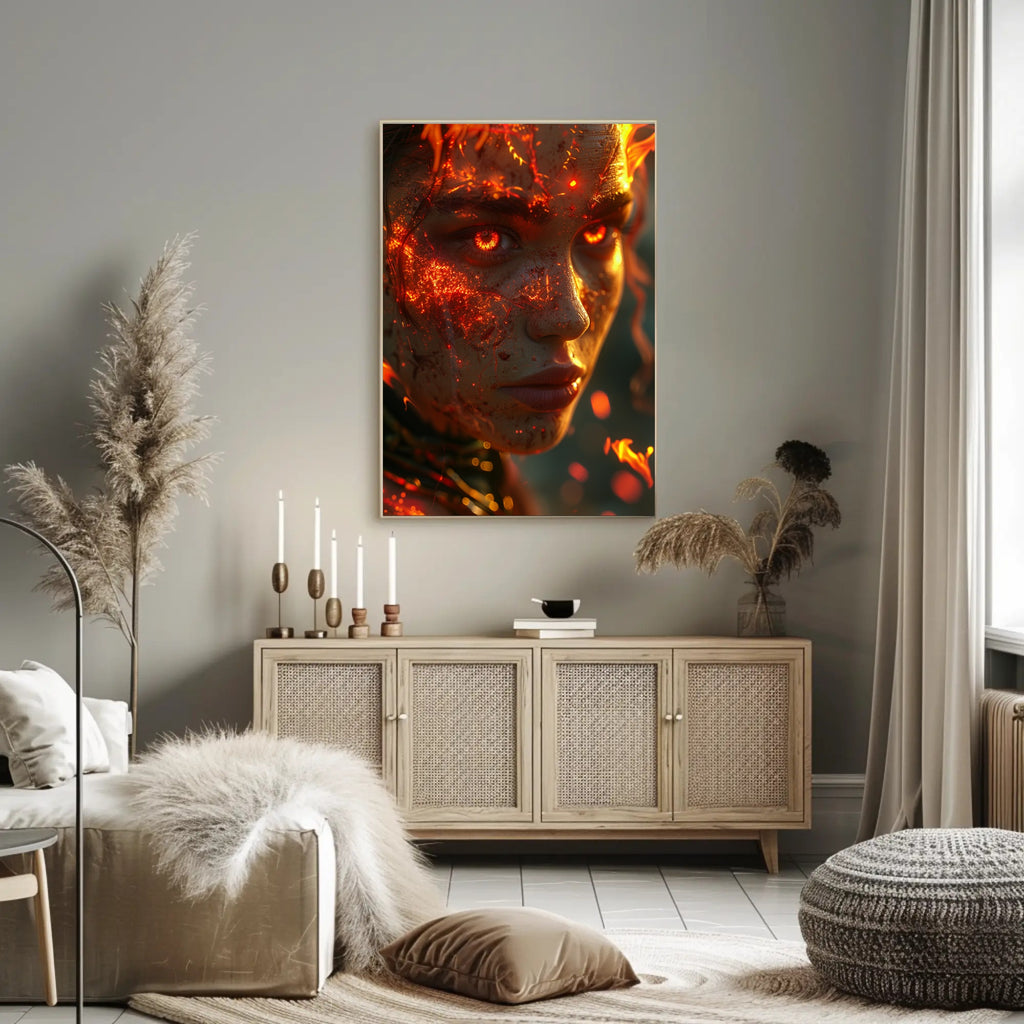 Bring an otherworldly spark to your walls with the Fiery Mythical Character Surreal Fantasy Art Poster by PosterGoat. This photorealistic, close-up portrait captures a mythic presence—glowing, ember-like eyes and molten, fiery details across the skin—creating an intense, magical atmosphere that commands attention in any room.