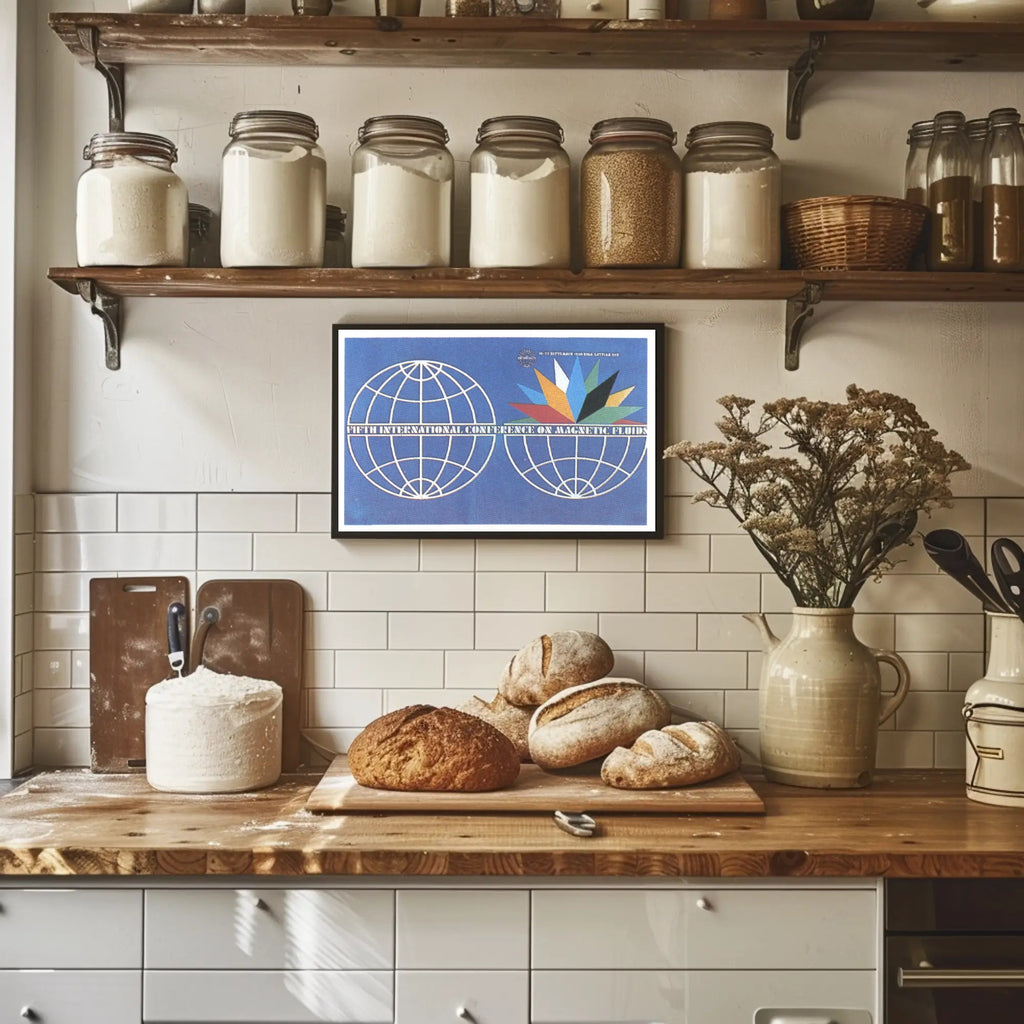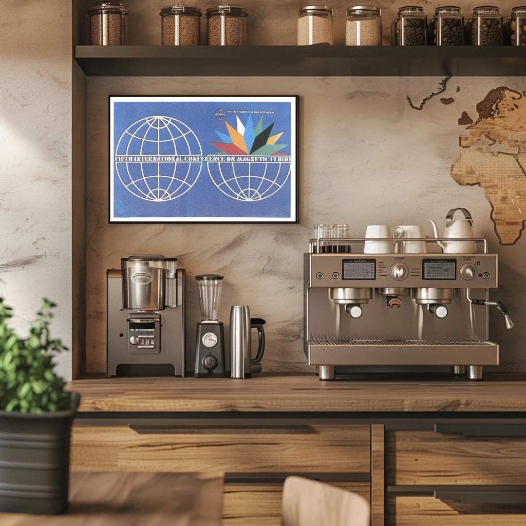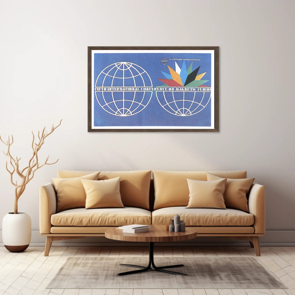 Fifth International Conference on Magnetic Fluids Poster by PosterGoat — a striking, vintage-inspired paper print that blends scientific heritage with bold, modern decor. Rendered on a deep blue field, the design pairs mirrored globe outlines with a faceted, multicolored emblem that evokes discovery, collaboration, and motion. This poster makes a sophisticated focal point for living rooms, offices, labs, or study corners.