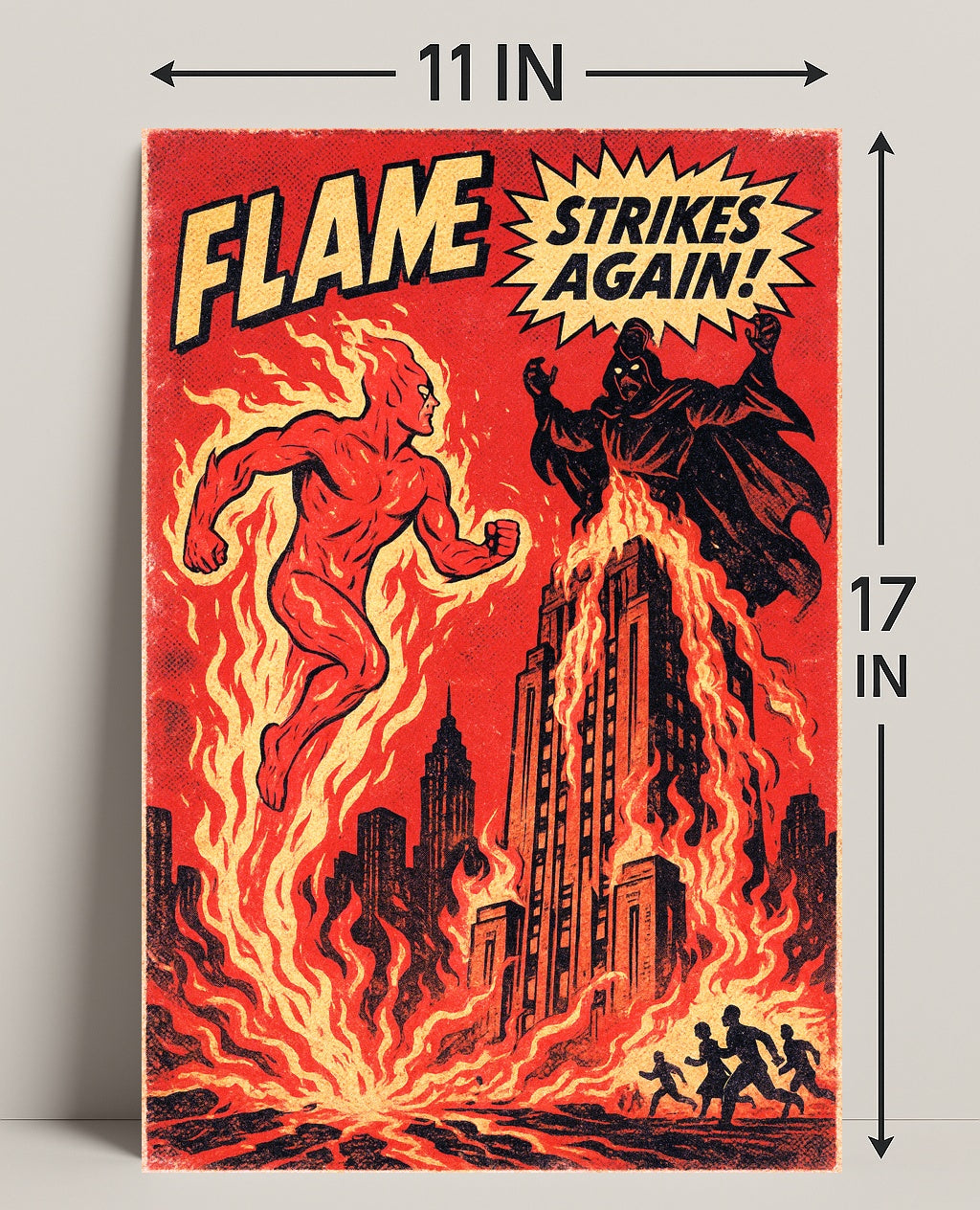 Bring blockbuster energy to your walls with the Flame Strikes Again! Poster from PosterGoat — a bold pop-art poster that looks like it leapt straight out of a vintage comic book. This high-impact artwork features a flaming hero soaring above a burning city as a dark cloaked villain looms, all rendered in fiery reds and distressed halftone texture for an authentic retro finish.