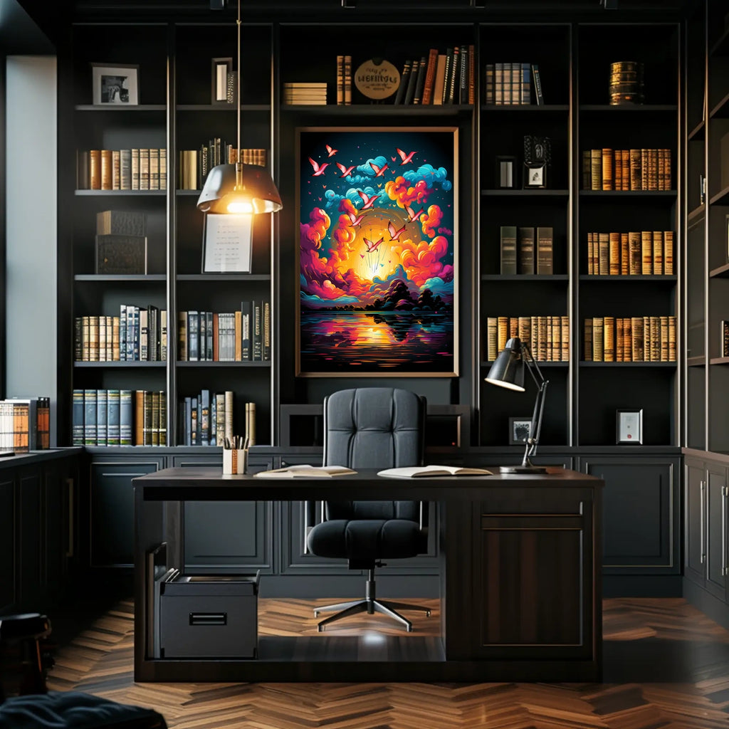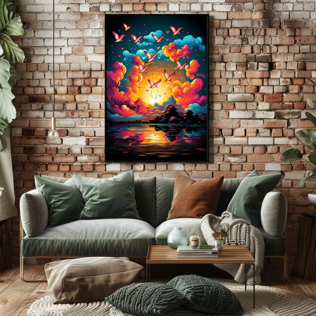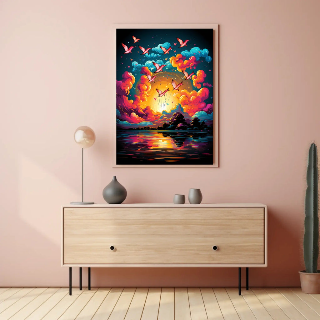 Flight of Freedom: Birds at Sunset Art Poster captures the awe-inspiring beauty of nature through a modern, surreal lens. A flock of birds glides in graceful flight beneath swirling, colorful clouds as a radiant setting sun pours warm light over tranquil waters, reflecting the sky’s vibrant hues. This poster's bright, saturated colors and smooth, flowing lines evoke motion and energy, inviting you to step into a dreamlike world of possibility.