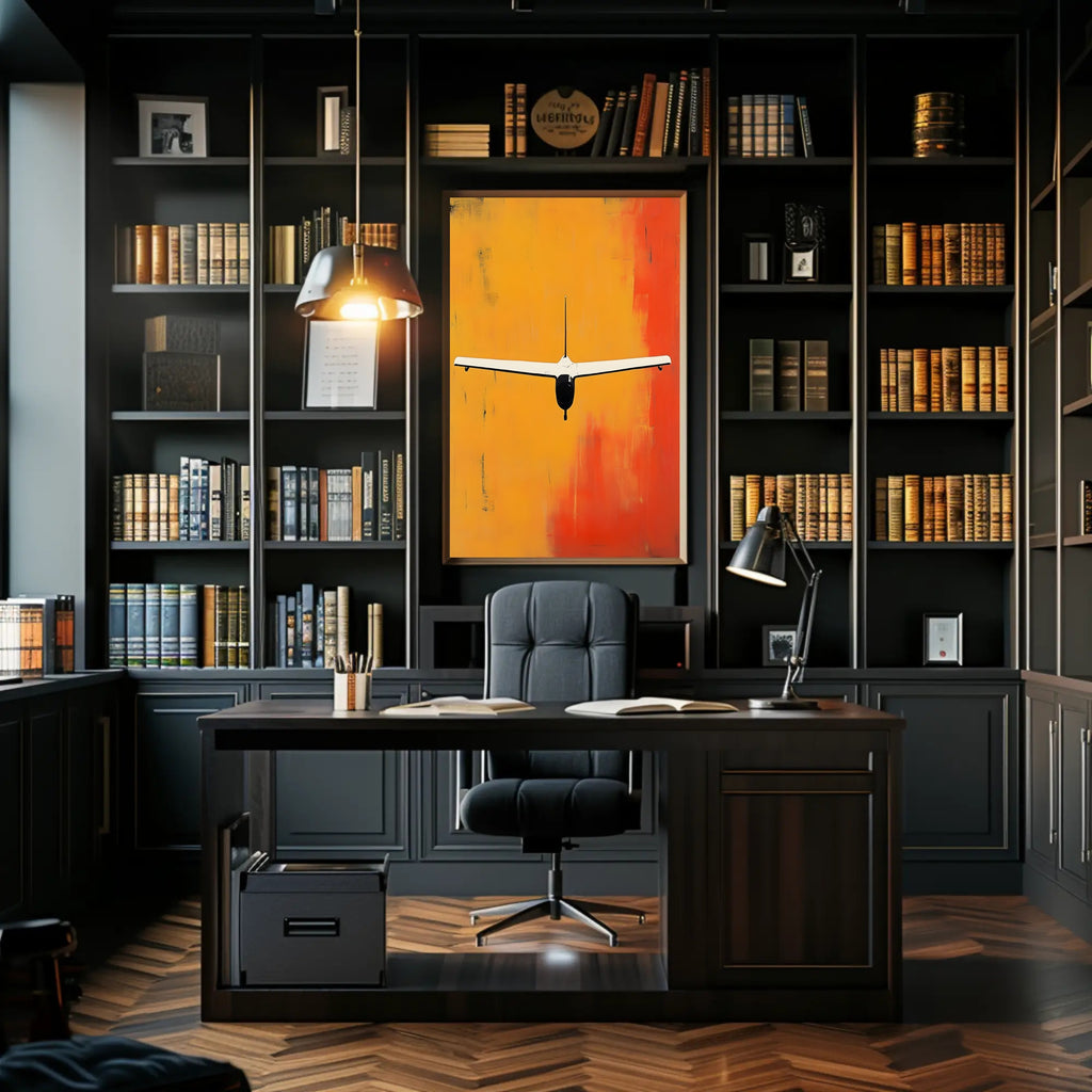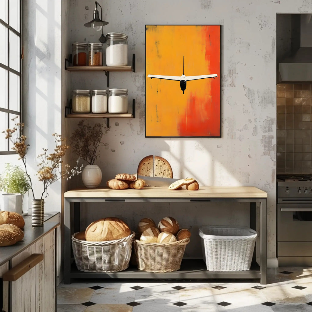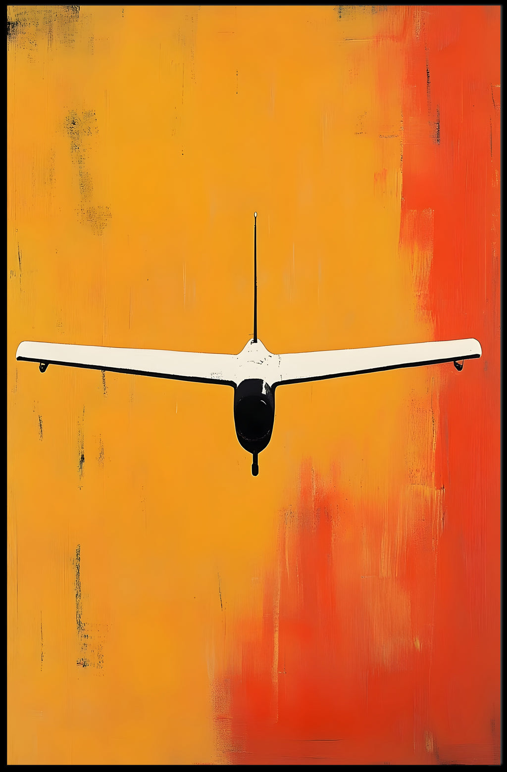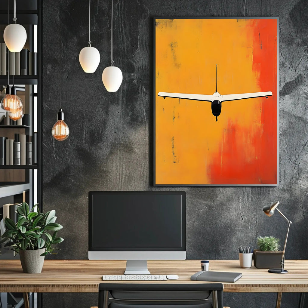 Transform your room with the Flight of Imagination Poster from PosterGoat. This striking art print features a minimalist front‑facing aircraft silhouette set against a warm orange-to-red textured background, creating a modern focal point that evokes travel, freedom, and creative possibility.