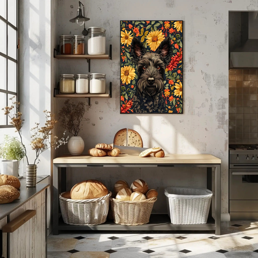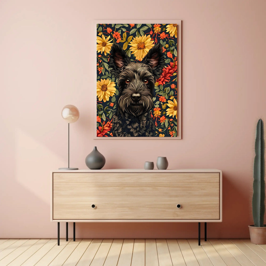 Add this PosterGoat original to your cart now and transform any blank wall into a warm, artful statement. Order today to elevate your space with vibrant floral energy and undeniable canine charm.