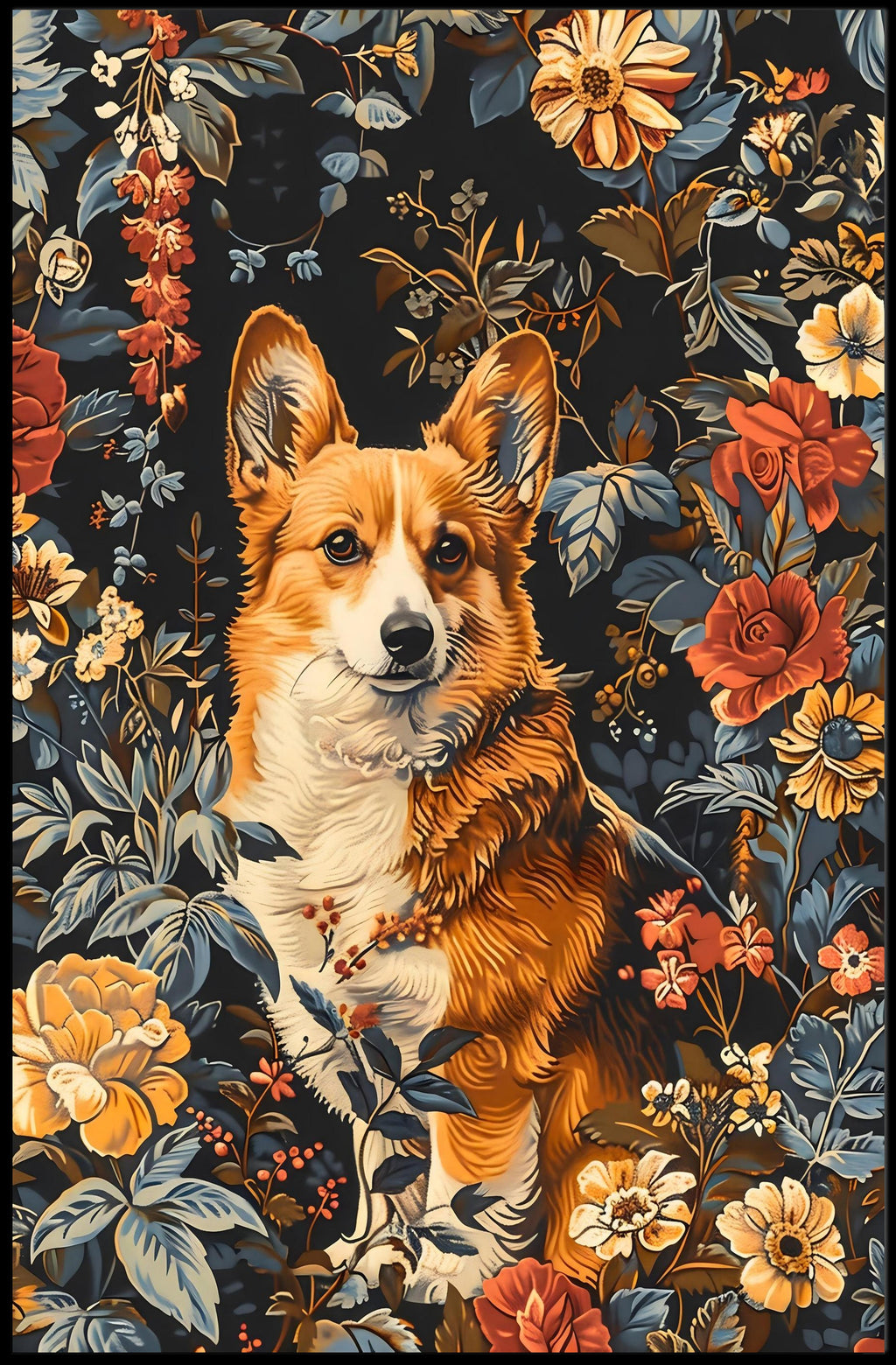 - Artful design: A warm, expressive corgi rendered in painterly detail surrounded by layered florals and foliage that create depth and visual interest.