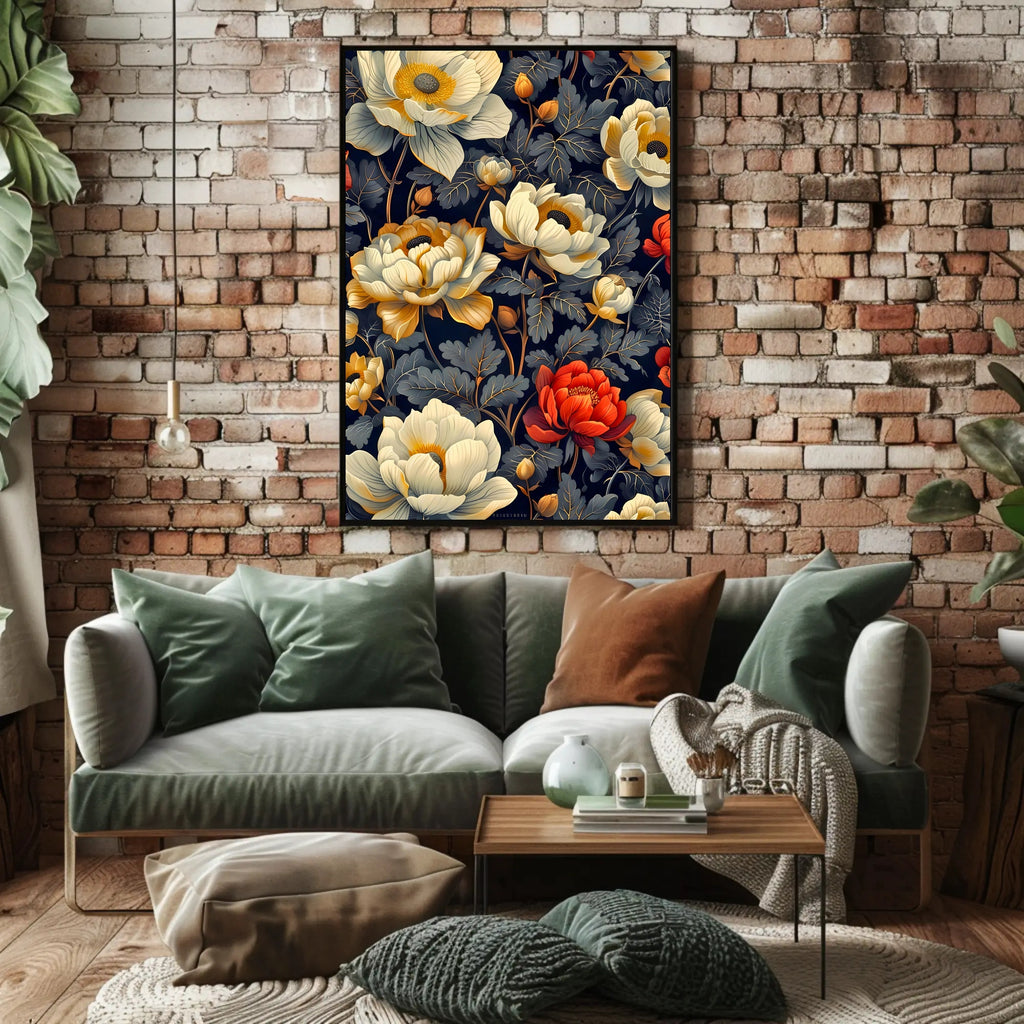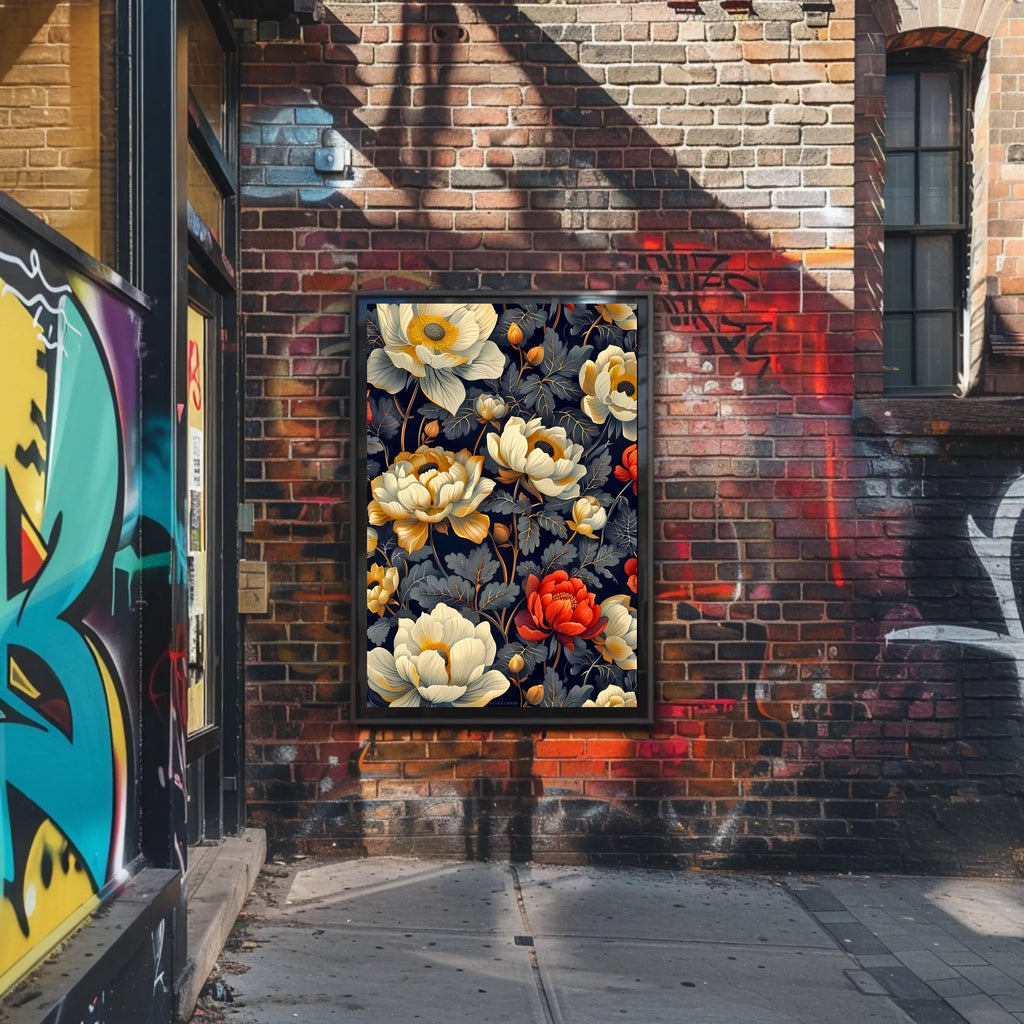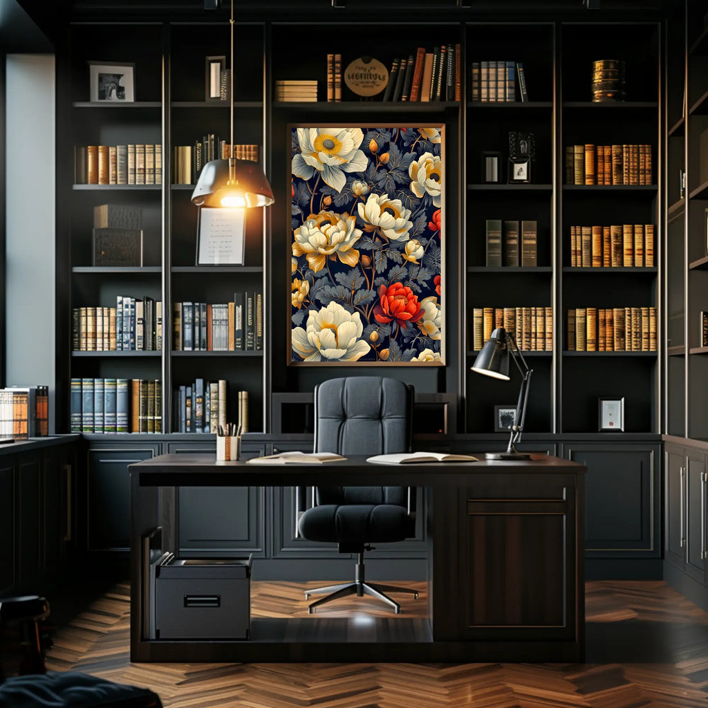 - Striking botanical illustration: Large cream and golden blooms and a single vibrant red flower float against a deep navy background, creating dramatic contrast and visual depth.