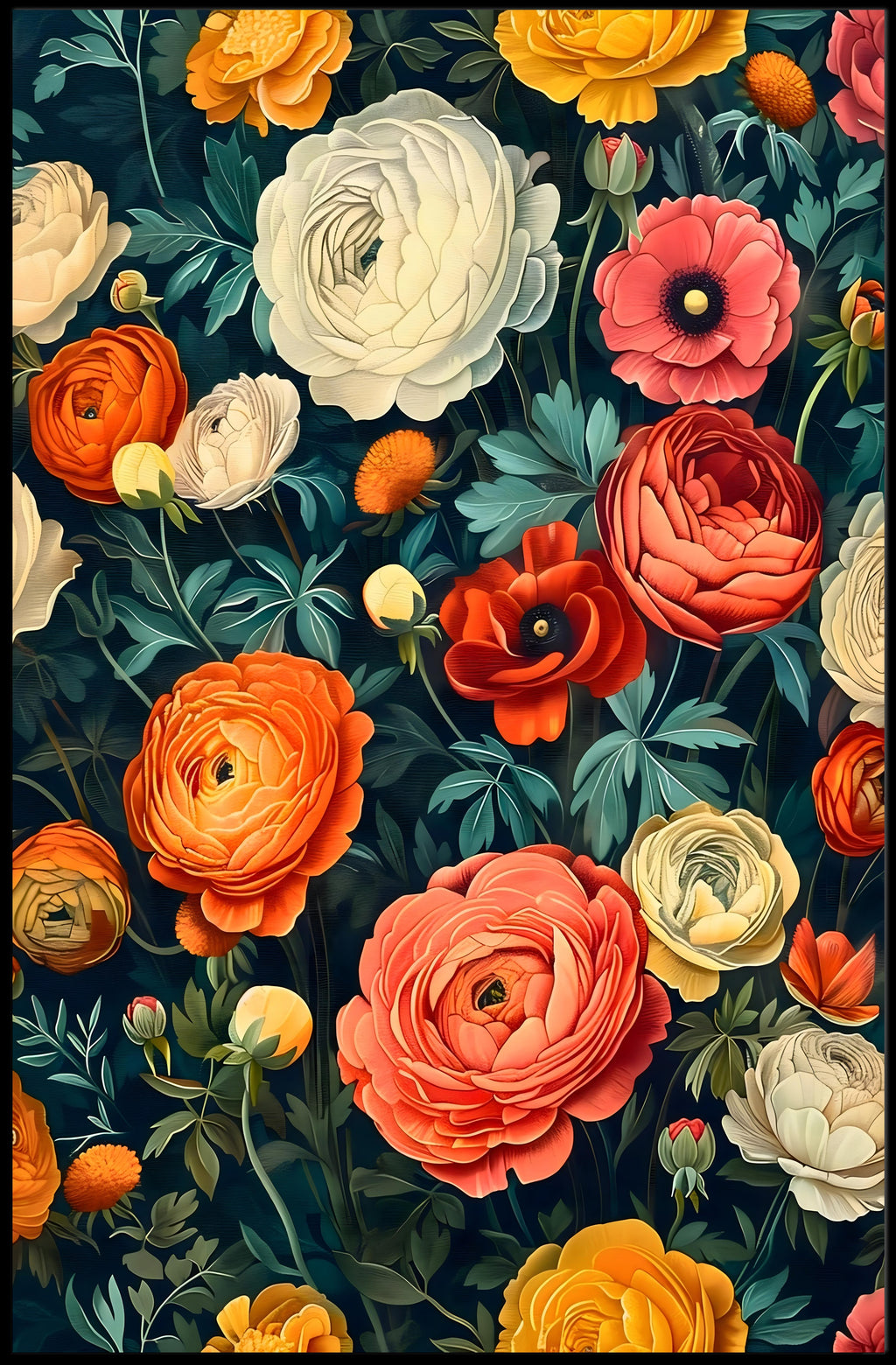 Transform your space with the Floral Harmony in Modern Vintage Artistic Poster from PosterGoat. This stunning piece of wall art beautifully merges vibrant floral elements with a touch of vintage charm. Featuring a rich array of roses and poppies in captivating shades of orange, white, pink, and yellow, this poster adds a burst of color and elegance to any room.
